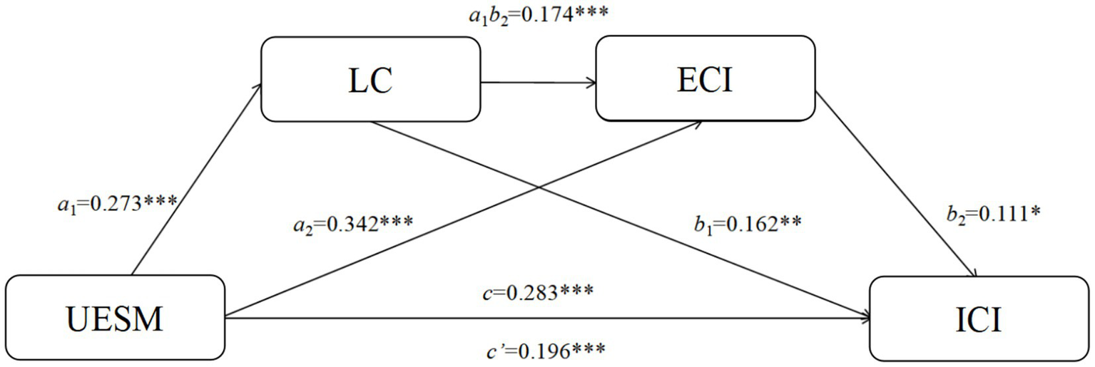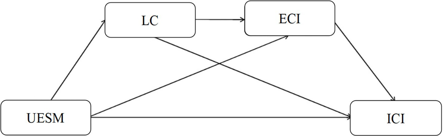 Figure 1. Hypothesis model. UESM, Use of English on social media; ICI, interpersonal communication intentions; LC, language confidence; ECI, English cultural identity.