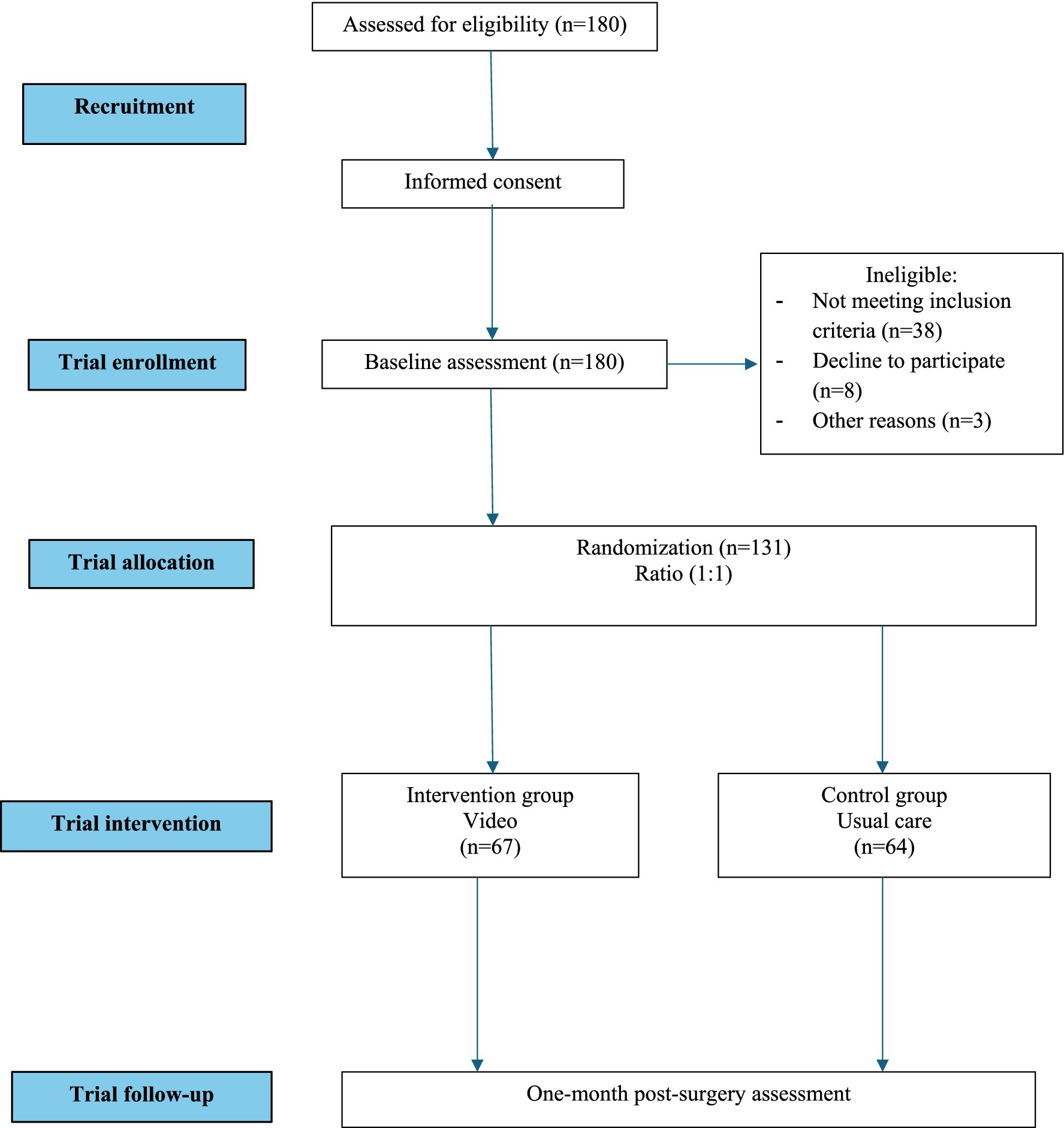 When patients agreed to participate in the study, they were assessed at baseline with the psychometric battery, both in IG and in CG, during the visit with the advanced practice nurse in outpatient clinics. To ensure randomization, patients who underwent surgery in even weeks received the additional nursing intervention proposed in this study (IG), while those who had surgery in odd weeks received treatment as usual (CG). Participants completed outcomes questionaries face-to-face preoperatively before hospital discharge post-measure. The time elapsed between the first and the second data collection was 1 month. Finally, coinciding with the one-month follow-up after the surgery, the participants were assessed again with the same battery of questionnaires, both CG and IG.