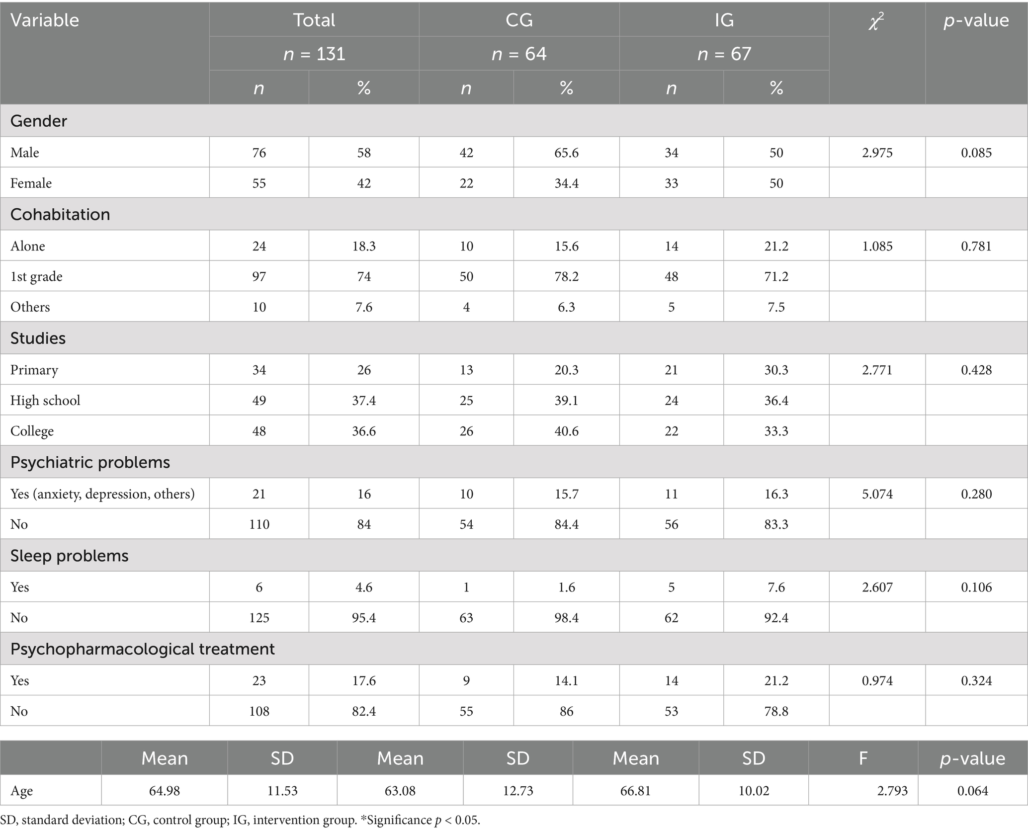 No significant differences were found between the CG and the IG in mean age neither other sociodemographic variable at baseline. A summary of participant demographic and clinical characteristics is provided in Table 1.