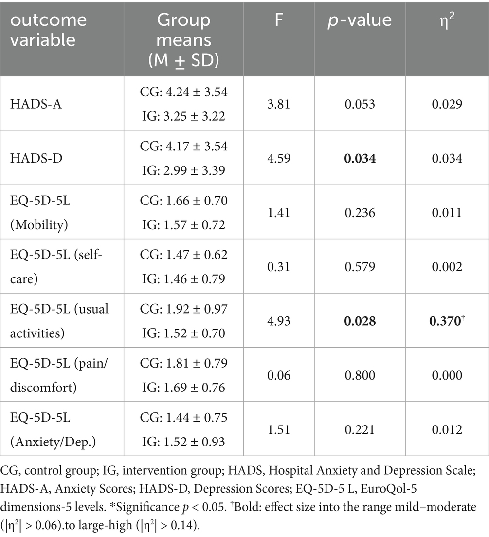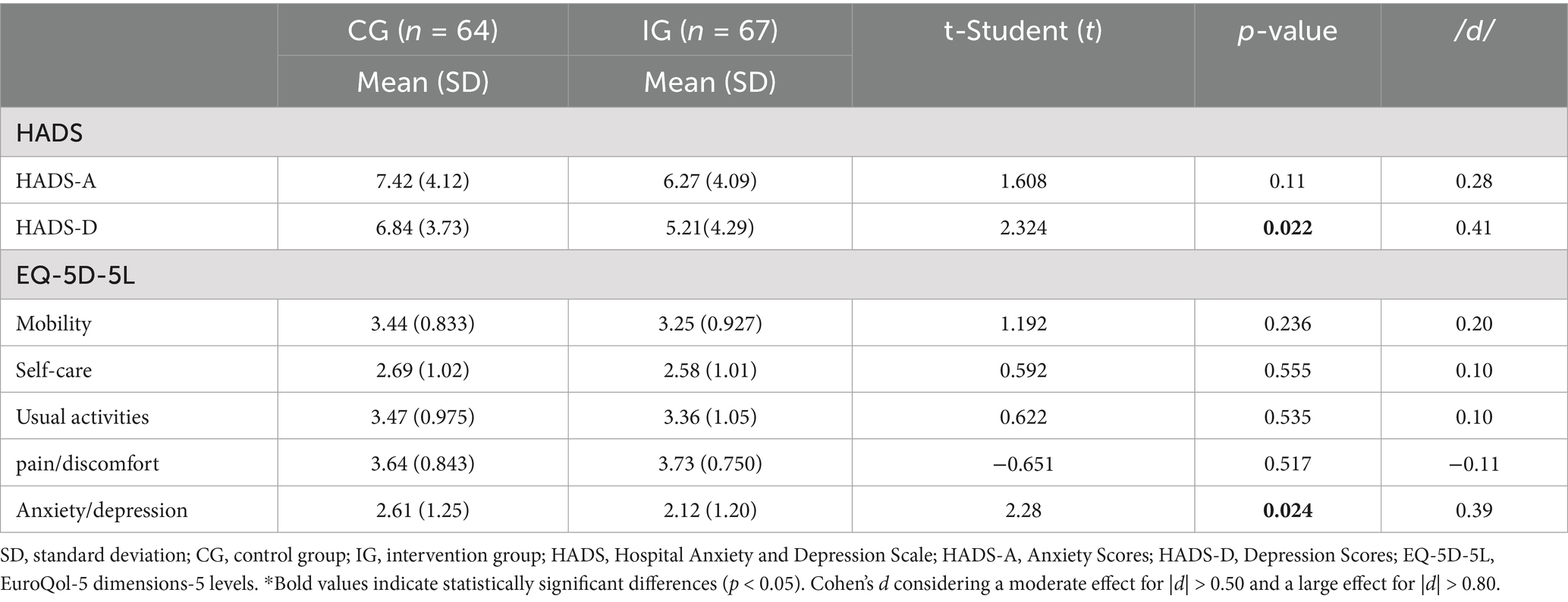 Table 2 presents the baseline characteristics of the CG and IG across the HADS and EQ-5D-5L. The results showed no statistically significant differences between groups at baseline in anxiety, as measured by HADS. However, the CG exhibited higher depressive symptoms on the HADS depression subscale compared to the IG. Regarding the EQ-5D-5L dimensions, no significant differences were found between groups in mobility, self-care, usual activities, or pain/discomfort. Notably, the anxiety/depression dimension of this scale indicated a significant difference, with the IG reporting fewer problems than the CG. However, the effect size (measured by Cohen’s d) for both significant differences was very small.