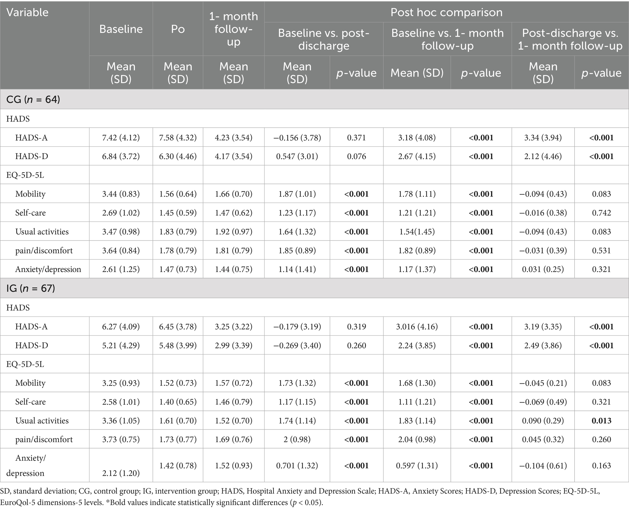 Table 3. Within-subject comparison of measures at baseline, hospital discharge, and one-month follow-up in the IG and CG.