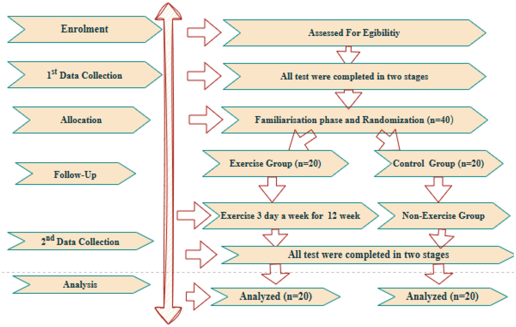 The effect size of the study was examined using G-power analysis. The determination of the requisite number of participants was conducted utilizing the GPower 3.1 software. In a two-sided test, the minimum detectable effect sizes for α = 0.05 were calculated as dz ≈ 0.54 (power = 0.80), dz ≈ 0.62 (power = 0.90), and dz ≈ 0.69 (power = 0.95). The study sample consisted of 40 children aged 12–14, who were selected through purposive sampling. The study was designed as a randomized controlled experimental trial. Participants were randomly assigned to two groups: the Exercise Group (E.G) and the Control Group (C.G). The exercise group was defined as n=20, and the control group as n = 20.