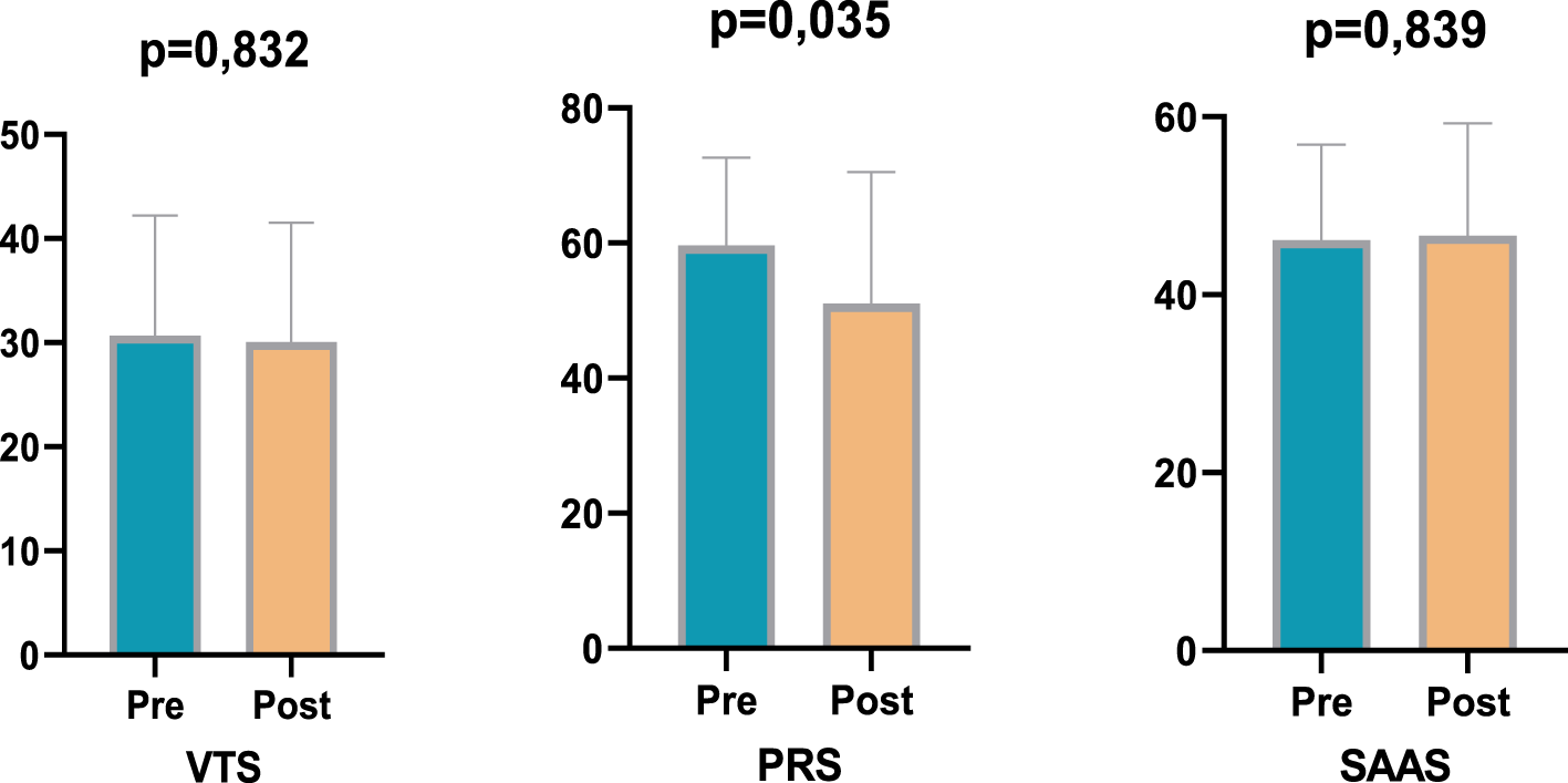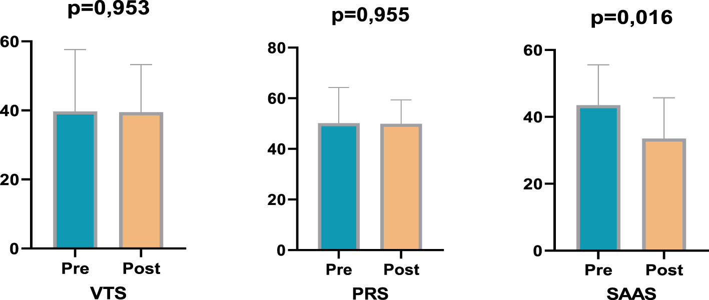 No significant difference was observed in violence tendency scores in the experimental group (p = 0.939). However, a decrease was observed in psychological resilience scores in comparison to pre-test values, and this decrease approached the threshold of significance with a medium effect size (p = 0.153, ηp2 = 0.053). This finding suggests that the intervention may have a limited effect on psychological resilience. While no significant change was detected in the social appearance anxiety variable in the experimental group (p = 0.120), a significant decrease in anxiety levels was observed in the control group (p = 0.029). This finding suggests that factors other than the experimental intervention may have been effective in the control group.