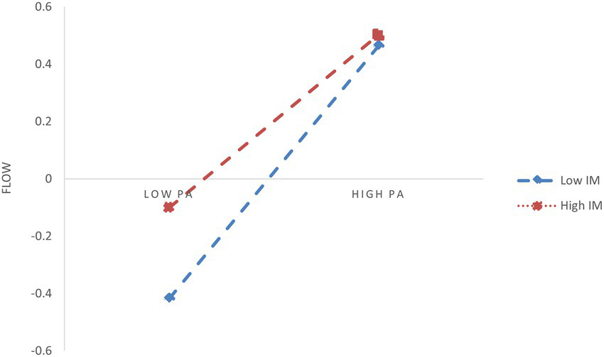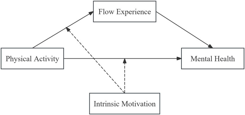 IM refers to the drive to engage in activities based on internal interests, autonomy, and the need for self-actualization, rather than relying on external rewards or pressures (Deci and Ryan, 1985). In the field of sport psychology, IM is considered a key factor influencing an individual’s persistence, engagement, and psychological benefits in PA (Richard et al., 1997). Research has shown that individuals with high levels of IM are more likely to view PA as an enjoyable experience and an opportunity for self-expression, leading to greater enthusiasm and persistence in participation (Teixeira et al., 2012). The link between PA and MH has been broadly established (Zhang et al., 2023; Zhao et al., 2024). Additionally, the flow experience generated during PA (i.e., a highly focused and immersive mental state) has been confirmed to enhance psychological resilience and facilitate emotional regulation (Goddard et al., 2023; Mirvis, 1991). However, the strength of these relationships may vary depending on an individual’s degree of IM. For instance, Kowal and Fortier (2000) discovered that individuals with higher intrinsic motivation were more prone to experiencing greater satisfaction and emotional improvement during PA, leading to more significant improvements in their MH. Furthermore, Jackson and Eklund (2002) highlighted a positive association between IM and flow experience, with individuals possessing high IM being more likely to enter a flow state during exercise, thus enhancing the beneficial impacts of exercise on MH. Recent studies further support the moderating role of IM. Guérin and Fortier (2013) discovered that intrinsic motivation (IM) moderates the effectiveness of PA interventions on the MH of active women, with the high IM group showing significantly greater improvements in mood than the low motivation group. Moreover, the positive effect of flow experience on MH may vary depending on an individual’s level of IM. When individuals participate in activities based on intrinsic interests, the flow state is more likely to translate into long-term psychological adaptation (Mao et al., 2024). Drawing from the theoretical and empirical evidence presented, this study proposes that intrinsic motivation could moderate the intensity of the relationship between PA, flow, and MH by enhancing an individual’s autonomous involvement in PA and deepening the flow experience. Therefore, the following hypotheses are proposed: