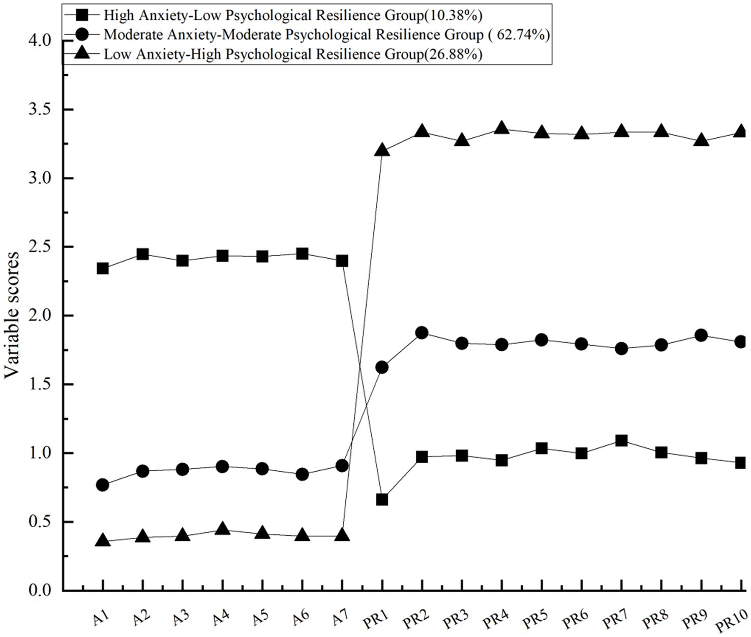 Figure 2. Latent classes of anxiety and psychological resilience. A1–A7 represent the 7 items for anxiety, PR1-PR10 represent the 10 items for psychological resilience.
