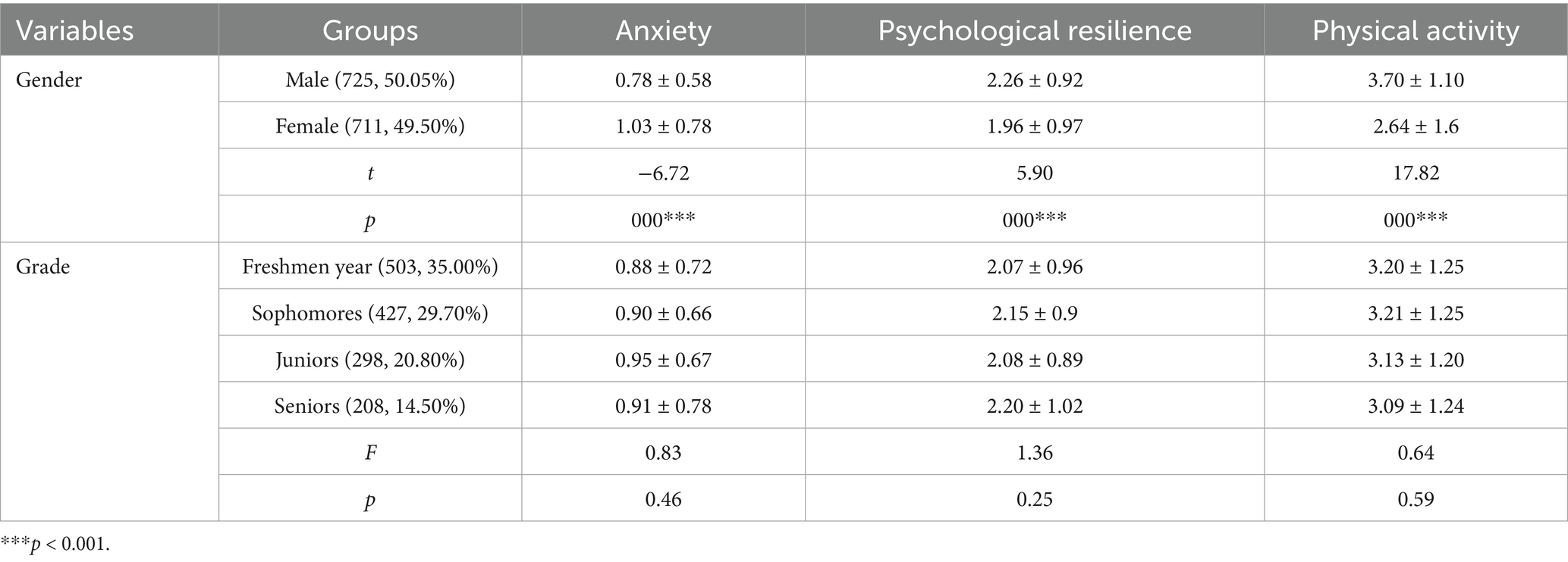 Analyses of anxiety, psychological resilience, and physical activity among college students revealed pronounced gender differences; Female participants exhibited markedly elevated anxiety symptomatology relative to their male counterparts. At the same time, males exhibited greater psychological resilience and higher engagement in physical activity. In contrast, no statistically significant variations were observed across academic year groups in any of these variables (Table 1).
