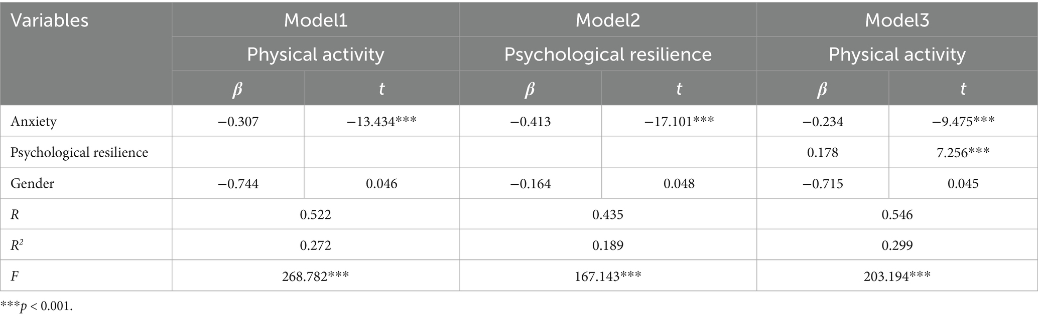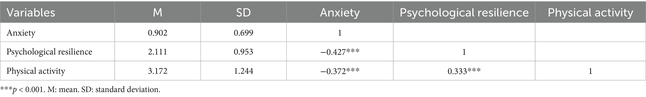 Anxiety demonstrated a statistically significant negative correlation with psychological resilience, and a statistically significant inverse relationship was observed with levels of physical activity. Additionally, psychological resilience was significantly positively correlated with physical activity (Table 2).