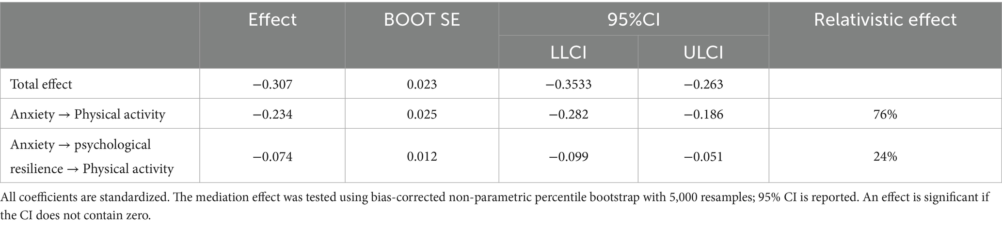 The intermediary function of psychological resilience was evaluated employing Hayes’ PROCESS macro (Model 4) based on 5,000 bias-adjusted bootstrap iterations (95% CI). The analysis treated anxiety as the predictor, psychological resilience as the mediating variable, and physical activity as the outcome, while incorporating gender as a covariate. Findings revealed a significant negative total effect of anxiety on physical activity (β = −0.307, p < 0.001). After accounting for the mediator, the direct impact of anxiety remained statistically significant (β = −0.234, p < 0.001). Furthermore, anxiety was found to be an important negative predictor of psychological resilience (β = −0.413, p < 0.001), whereas psychological resilience exhibited a significant positive association with physical activity (β = 0.178, p < 0.001) (Table 3).