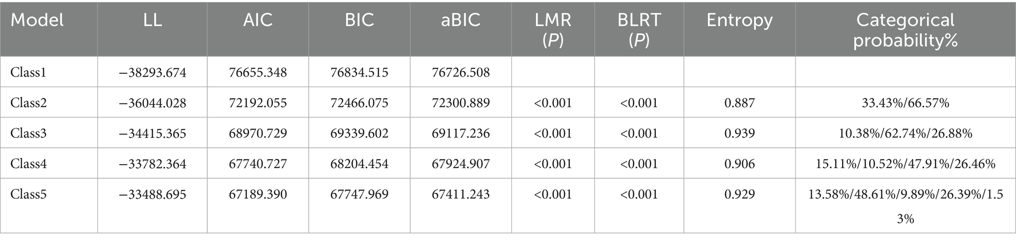 Statistical analyses were conducted using SPSS 26.0 and Mplus 8.3. First, common method bias was assessed using Harman’s single-factor test. Pearson correlation analysis was employed to examine the relationships among anxiety, psychological resilience, and physical activity in university students. Next, a mediation structural equation model was constructed based on Model 4 of the PROCESS macro (Tu et al., 2021). The bootstrap method (95% confidence interval; 5,000 resamples) was applied within a linear regression framework to test whether the mediating effect of psychological resilience between anxiety and physical activity was statistically significant. For the structural equation models, the following thresholds for good model fit were applied: CFI and TLI > 0.90, RMSEA and SRMR < 0.08. Finally, LCA was performed in Mplus 8.3 to identify heterogeneous subgroups based on profiles of anxiety and psychological resilience among the students. Model fit in LCA was evaluated using the following criteria: low values of Akaike Information Criterion(AIC), Bayesian Information Criterion(BIC), and sample-size-adjusted BIC (aBIC) indicated better fit; entropy closer to 1 suggested clearer class separation; and significant results (p < 0.05) in both the Lo–Mendell–Rubin adjusted likelihood ratio test (LMR-LRT) and the bootstrap likelihood ratio test (BLRT) indicated that the k-class model fit significantly better than the (k-1)-class model. A significance level of α = 0.05 was used for all inferential tests.