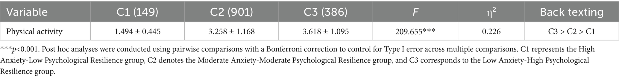 Analysis of variance revealed statistically significant differences in physical activity across the derived latent profiles based on anxiety and resilience patterns (p<0.001). Post-hoc comparisons revealed that all pairwise contrasts between the three groups were statistically significant. Specifically, the Low Anxiety-High Psychological Resilience Group reported the highest level of physical activity. The Moderate Anxiety-Moderate Psychological Resilience Group profile demonstrated intermediate physical activity engagement, whereas the High Anxiety-Low Psychological Resilience Group subgroup exhibited the minimal activity level among all identified groups (Table 6).
