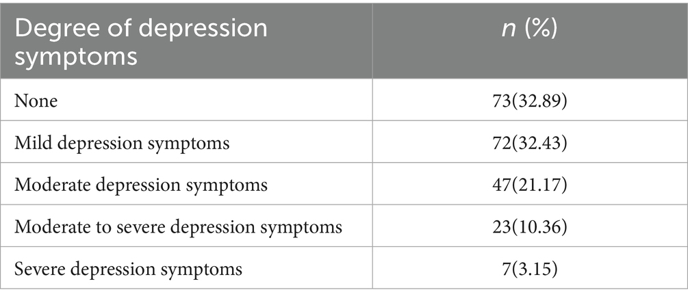 The score of depression symptoms in this study was (7.69 ± 5.75); Among the 222 cerebral patients, 149 were depressed (67.12%). Among them, 72 were mild depression symptoms (32.43%). Forty-seven were moderately depressed (21.17%); 23 cases were moderate to severe depression symptoms (10.36%). Seven were severe depression symptoms, with an incidence of 3.15%, as shown in Table 2.