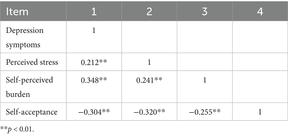 Correlation analysis among depression symptoms, perceived stress, self-acceptance and self-perceived burden