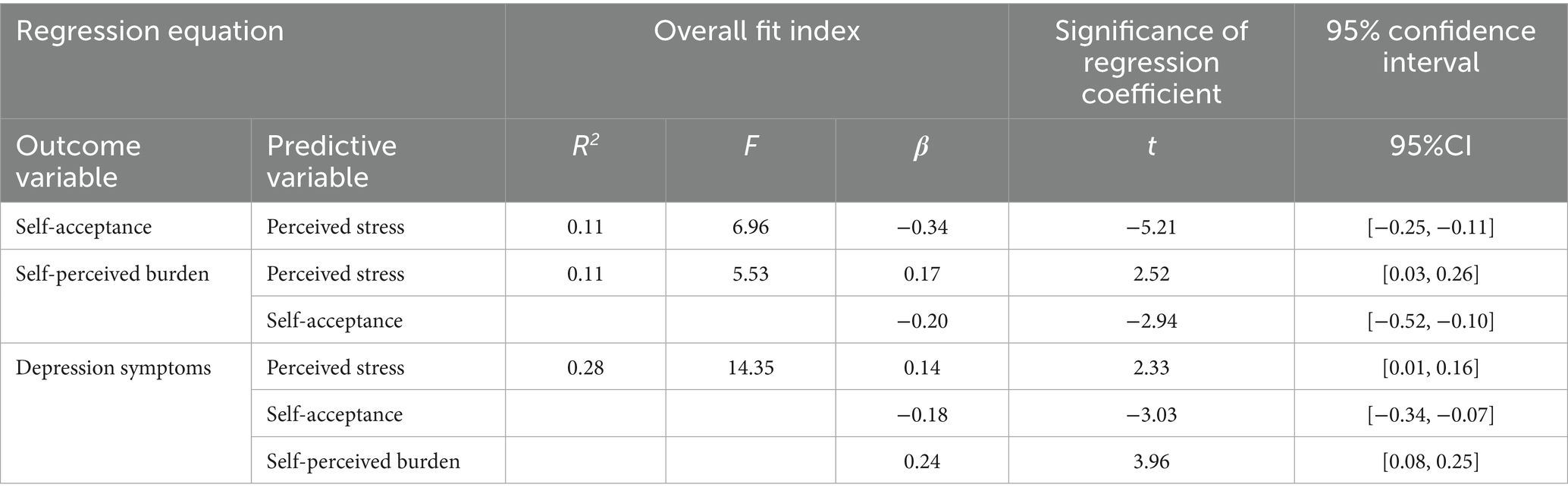 The results of correlation analysis showed that perceived stress was significantly positively correlated with self-perceived burden and depression symptoms (r = 0.212–0.241, p < 0.01). Perceived stress significantly negatively correlated with self-acceptance (r = −0.320, p < 0.01), suggesting that higher stress levels may substantially undermine a patient’s self-acceptance. Self-perceived burden was positively correlated with depression symptoms (r = 0.348, p < 0.01), and negatively correlated with self-acceptance (r = −0.255, p < 0.01). Self-acceptance was negatively correlated with depression symptoms (r = −0.304, p < 0.01). The overall pattern of results validates the clinical relevance of our theoretical model, suggesting that an integrated approach addressing stress, self-acceptance, and perceived burden may be more effective than focusing on any single factor alone (see Table 3 for details).