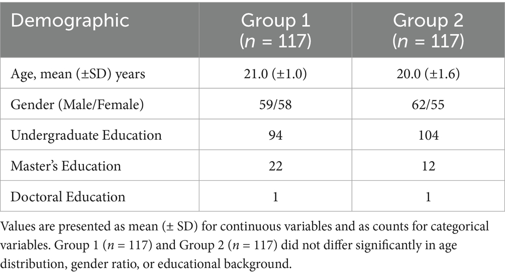 A total of 234 students (aged 18–25) were recruited through online advertisements and university forums. Participants were recruited via both online platform (NaoDao, https://www.naodao.com/) and offline posters on campus. Stratified randomization was used to divide participants into two groups to reduce fatigue effects during music rating. First, the sample was stratified by gender, and within each gender subgroup, participants were randomly ordered using computer-generated random numbers. The first 117 participants (59 males and 58 females) were assigned to Group 1, and the remaining 117 participants (62 males and 55 females) were assigned to Group 2. All participants reported normal hearing and no history of neurological or psychiatric disorders.
