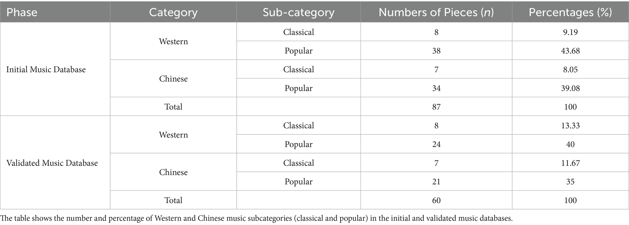 The initial music database consisted of 87 music excerpts selected to represent a diverse range of genres, including Western and Chinese music, categorized as Classical and Popular music (see more details in Table 2). These categories were chosen to provide a broad spectrum of cultural and stylistic diversity, which could potentially influence listeners’ emotional responses.