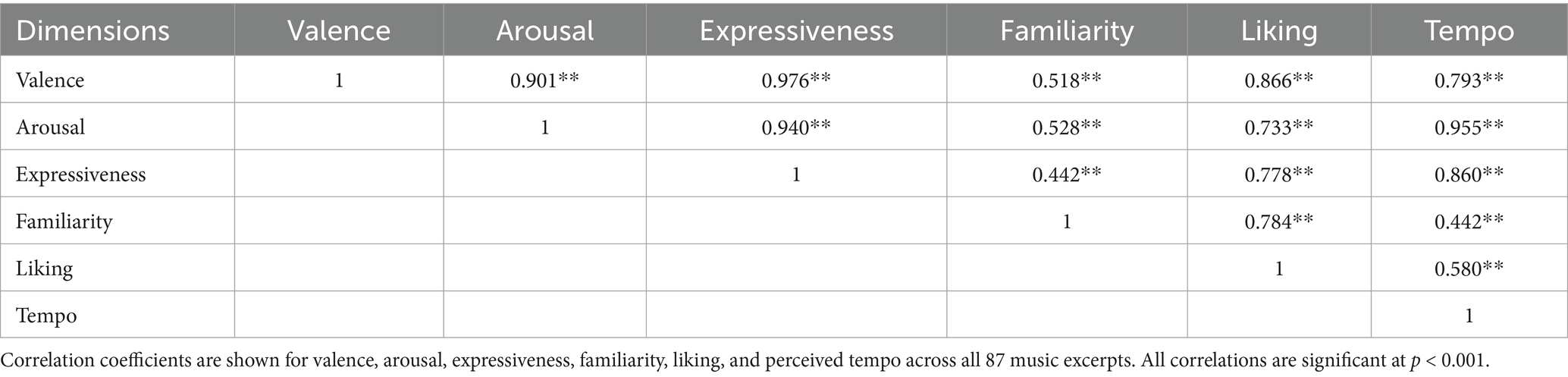 To examine the relationships among the six evaluative dimensions, Pearson correlation coefficients were calculated based on the mean ratings of each musical excerpt (N = 87). As shown in Table 3, all dimensions were significantly and positively correlated (ps < 0.001), suggesting a coherent internal structure among the affective and perceptual components.