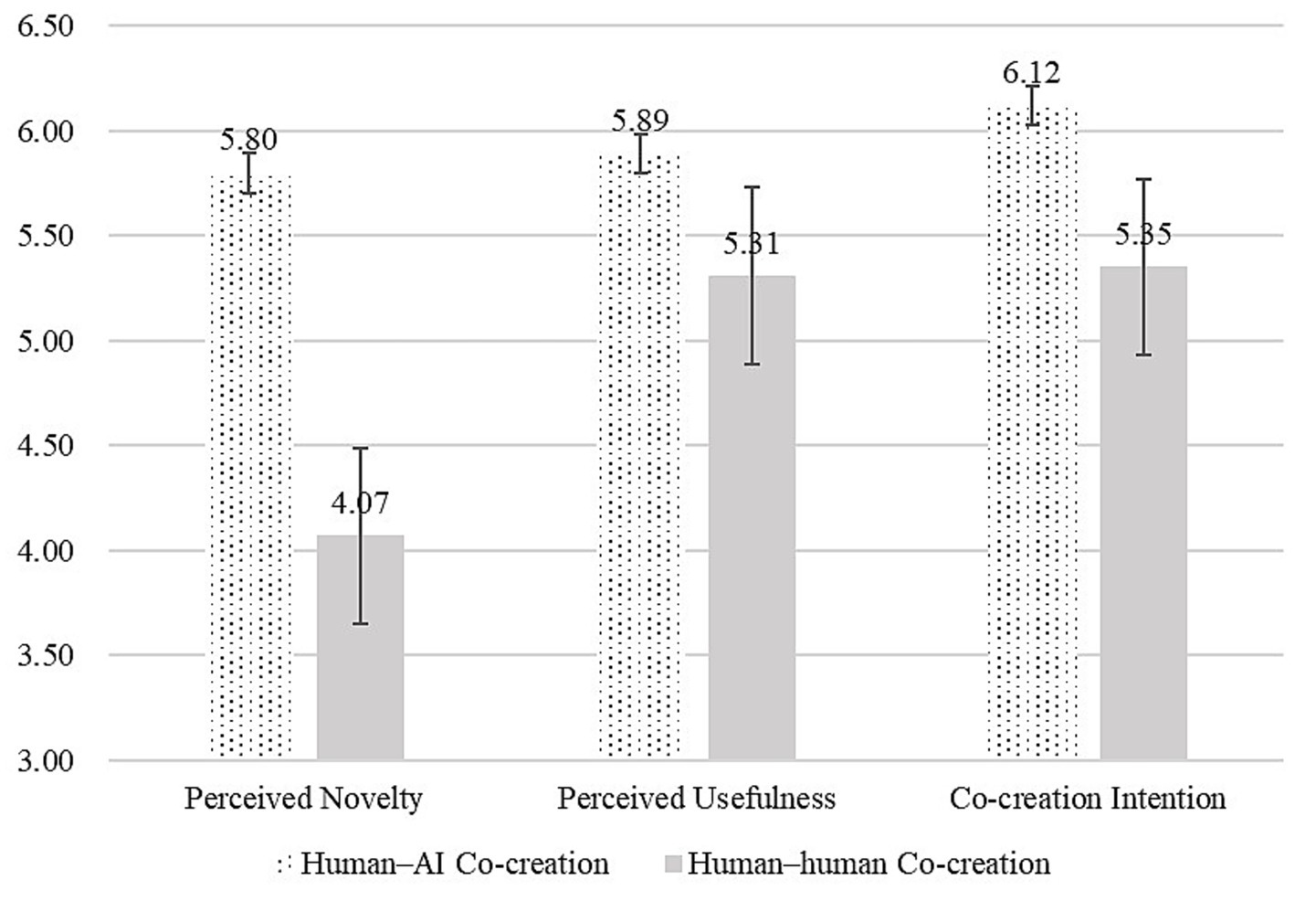 Perceived usefulness typically refers to the extent to which individuals believe that using a particular tool or collaborating with a particular partner will enhance their performance or help them achieve their goals (Davis, 1989). In human–human co-creation settings, human partners hold advantages in contextualized understanding, commonsense reasoning, and the integration of tacit knowledge; they can discern subtle needs, provide immediate feedback, and coordinate the overall direction, thereby minimizing deviations and errors (DeChurch et al., 2024; Sun et al., 2024). This process not only fosters a stronger sense of safety and effectiveness but also heightens participants’ subjective perception of the collaboration’s usefulness. Moreover, human partners can offer emotional support and social feedback during interaction; these non-functional values are likewise foundational to co-creation (Tang et al., 2024; McGuire et al., 2024) and further strengthen participants’ judgments that the collaboration is “worthwhile” (Grenier et al., 2024; Jiang et al., 2024). Therefore, human–human co-creation often yields higher perceived usefulness.