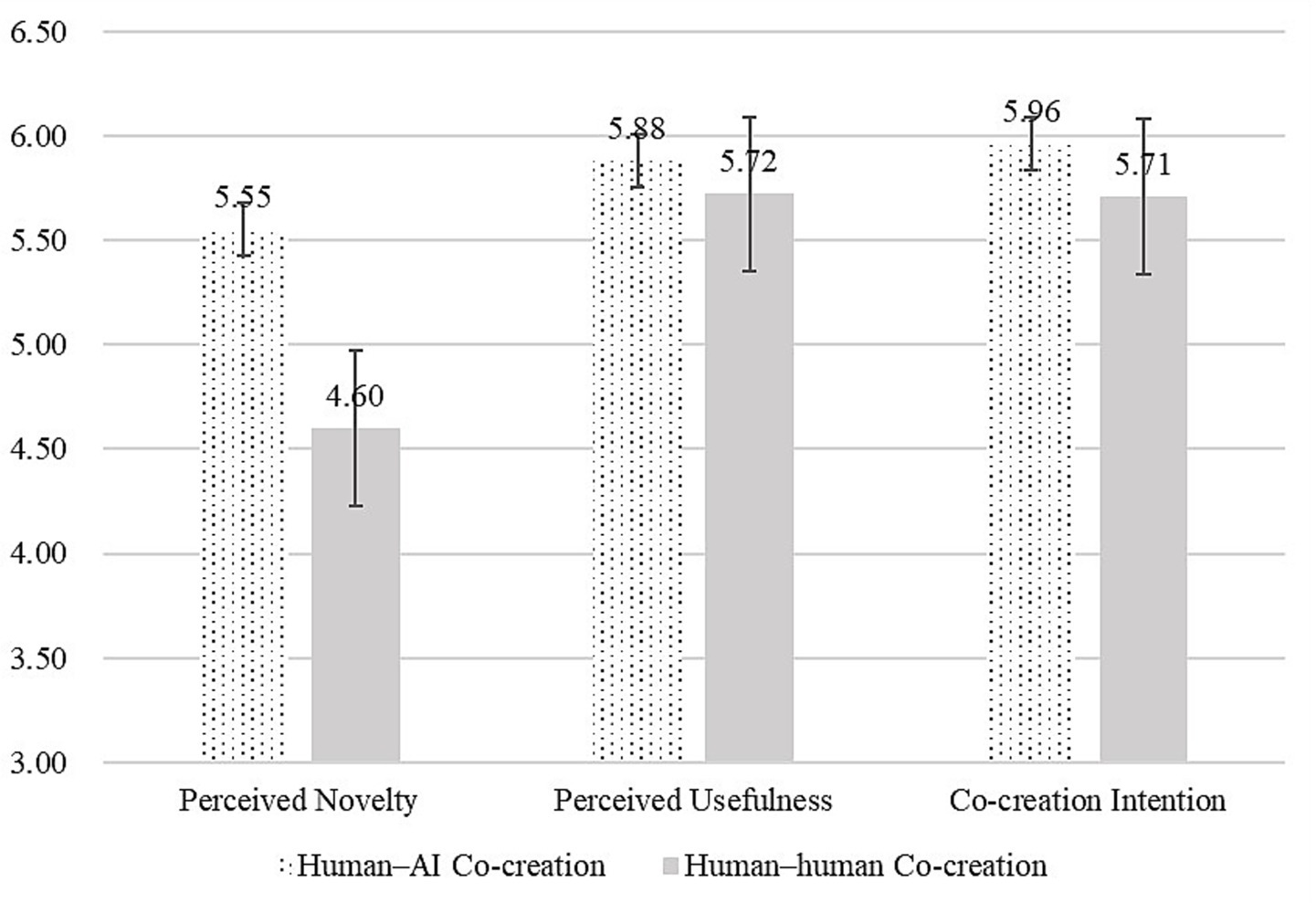 Perceived novelty refers to individuals’ subjective sense of how new an experience or outcome is—namely, the extent to which it feels unprecedented, unfamiliar, and capable of eliciting unexpected stimulation and surprise (Runco and Jaeger, 2012). In the context of co-creation, a high level of perceived novelty means participants regard the focal idea as distinctive and new, thereby becoming more readily engaged and experiencing more positive affect. Compared with human partners, AI—drawing on a vast and heterogeneous knowledge base—can generate nontraditional and even unexpected solutions (Doshi and Hauser, 2024; Tigre Moura et al., 2023); such cross-domain generation often feels refreshing and sparks new inspiration (Chen et al., 2025). For example, Li et al. (2025) shows that customers experience a heightened sense of novelty when robots are involved, which in turn strengthens their willingness to co-create value. Moreover, in human collaboration, individuals often suppress out-of-the-box ideas due to concerns about criticism; when interacting with AI, evaluation apprehension (i.e., the feeling of being judged) is comparatively weaker, making people more willing to propose unconventional ideas and thereby further amplifying perceived novelty (Bullock Muir et al., 2024). Therefore, we infer that, relative to human–human co-creation, human–AI co-creation is more likely to elicit stronger perceived novelty.