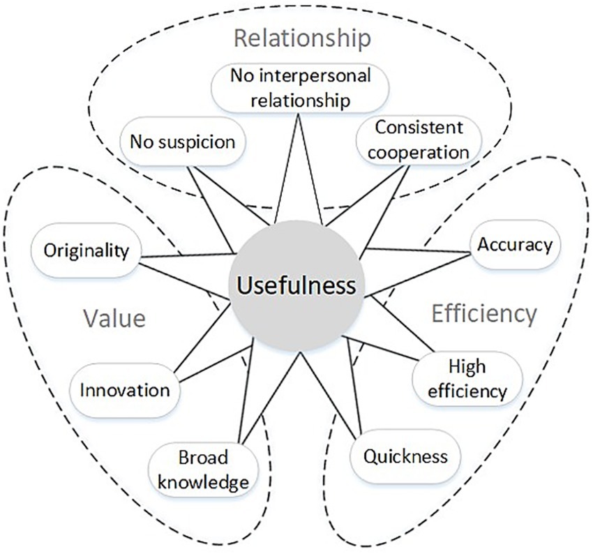 The analyses further revealed three driving factors of AI’s usefulness: efficiency, value, and relationship. Participants widely reported that AI markedly improves work efficiency, with “high efficiency” (n = 34), “quickness” (n = 18), and “accuracy” (n = 15) emerging as the primary usefulness descriptors. In addition, AI’s value for innovation and cross-domain knowledge acquisition was recognized: terms such as “broad knowledge” (n = 10), “originality” (n = 9), and “innovation” (n = 5) reflect AI’s advantages in creative inspiration and breaking mental sets. Finally, AI’s relationship characteristics—captured by “no interpersonal relationship” (n = 8), “no suspicion” (n = 7), and “consistent cooperation” (n = 4)—suggest that collaboration with AI avoids emotional volatility and communication barriers, thereby improving collaborative efficiency.
