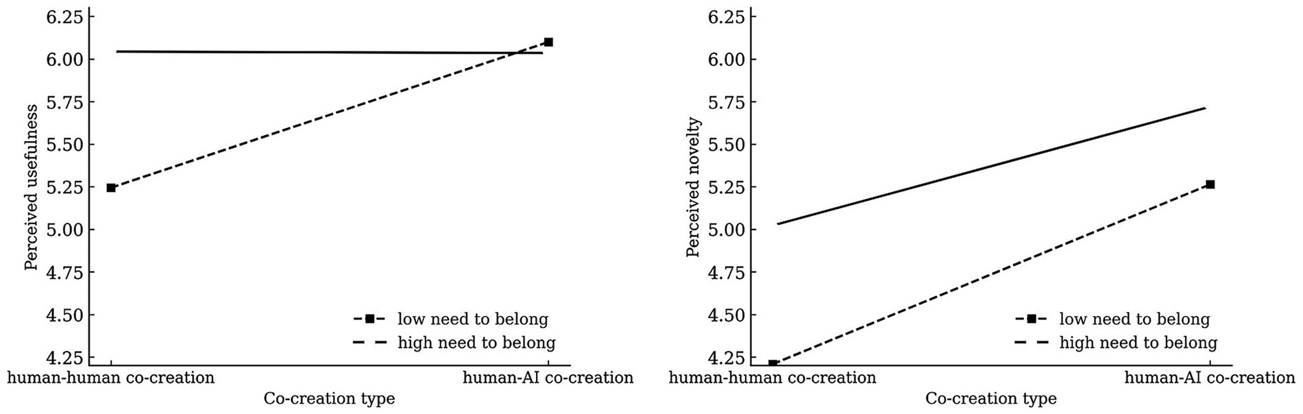 We conducted a mediated moderation analysis using PROCESS Model 7 (Hayes, 2017) with 5,000 bootstrap resamples. The results showed that the interaction between co-creator type and the need to belong did not significantly affect novelty [β = −0.193, SE = 0.150, t = −1.283, p = 0.201, 95% CI (−0.489, 0.103)], but had a significant negative effect on usefulness [β = −0.466, SE = 0.077, t = −6.024, p < 0.001, 95% CI (−0.618, −0.314)]. Conditional effect analysis revealed that at low levels of the need to belong, the positive effect of co-creator type on usefulness was strongest [β = 0.855, SE = 0.102, t = 8.427, p < 0.001, 95% CI (0.656, 1.055)], whereas at high levels of the need to belong, this effect was not significant [β = −0.008, SE = 0.101, t = −0.081, p = 0.936, 95% CI (−0.207, 0.191)].