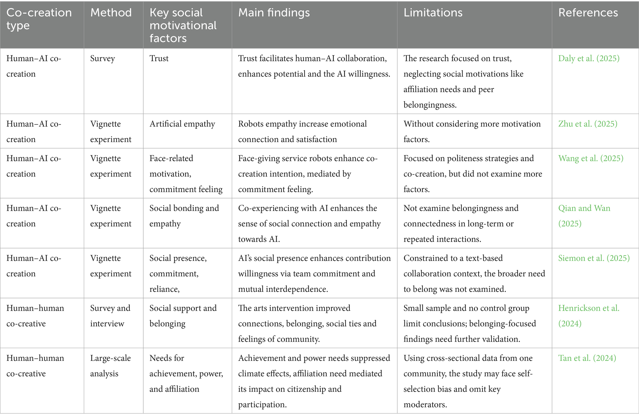 A growing body of empirical research on co-creation has incorporated social motivational factors, as briefly summarized in Table 2. In human–human co-creation research, the need to belong has frequently been recognized as a key factor influencing co-creative behavior. The need to belong is an intrinsic social motive where individuals desire to form close interpersonal relationships (Baumeister and Leary, 1995), and it significantly influences people’s preferences and engagement in collaborative efforts (Afota et al., 2024). However, in studies on human–AI co-creation or comparisons between two co-creation types, while many have examined social motivational factors such as trust (Daly et al., 2025), empathy (Zhu et al., 2025; Qian and Wan, 2025), reliance (Siemon et al., 2025) and commitment feeling (Wang et al., 2025), the need to belong, although a fundamental social motivation, has rarely been directly investigated or has been treated only as a mediating variable. Building on these observations, this study introduces the need to belong as a moderator to help uncover individual differences in response to different co-creation types and to further clarify the boundary conditions under which social motivations operate in human–AI co-creation.