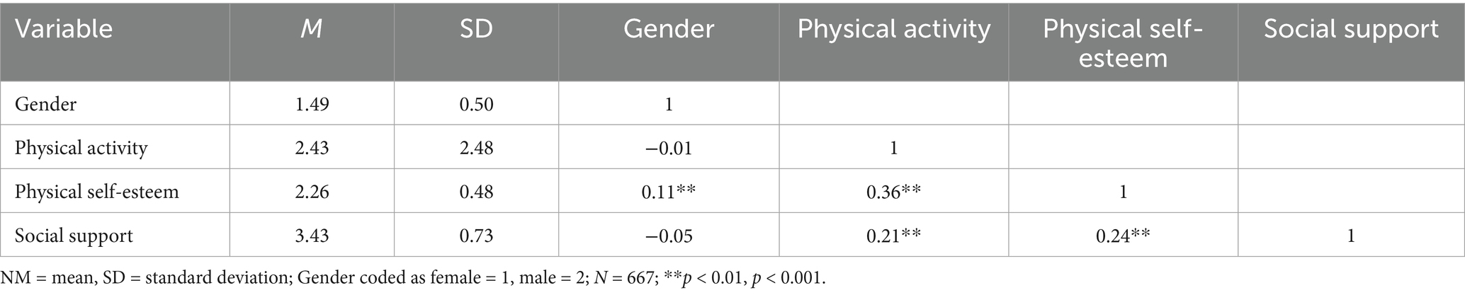 Relationship between physical activity and social support: mediating role of physical self-esteem and moderating role of gender
