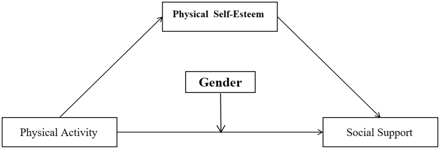 The present study aims to address this research gap by constructing a moderated mediation model (Figure 1) to systematically examine the pathways through which physical activity affects social support among Chinese college students. Specifically, physical self-esteem is introduced as a mediator to reveal the underlying psychological mechanism, while gender is incorporated as a moderator to test for differential effects and boundary conditions across gender groups. Through theoretical modeling and empirical testing, the study seeks to provide new theoretical underpinnings and practical approaches for interventions aimed at enhancing social support.