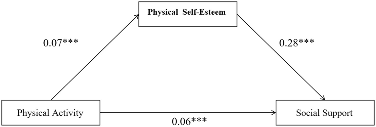 Physical activity was entered as the independent variable, social support as the dependent variable, and physical self-esteem as the mediator. Based on the frameworks of Hayes (2013) and Wen and Ye (2014), PROCESS macro Model 4 was employed to test the mediating effect. The results (Table 2) showed that: Physical activity significantly and positively predicted physical self-esteem (β = 0.07, p < 0.001). Physical activity significantly predicted social support (β = 0.06, p < 0.001), confirming the existence of the direct effect. When both physical activity and physical self-esteem were entered into the regression equation, both remained significant positive predictors of social support, supporting the hypothesized mediation model.