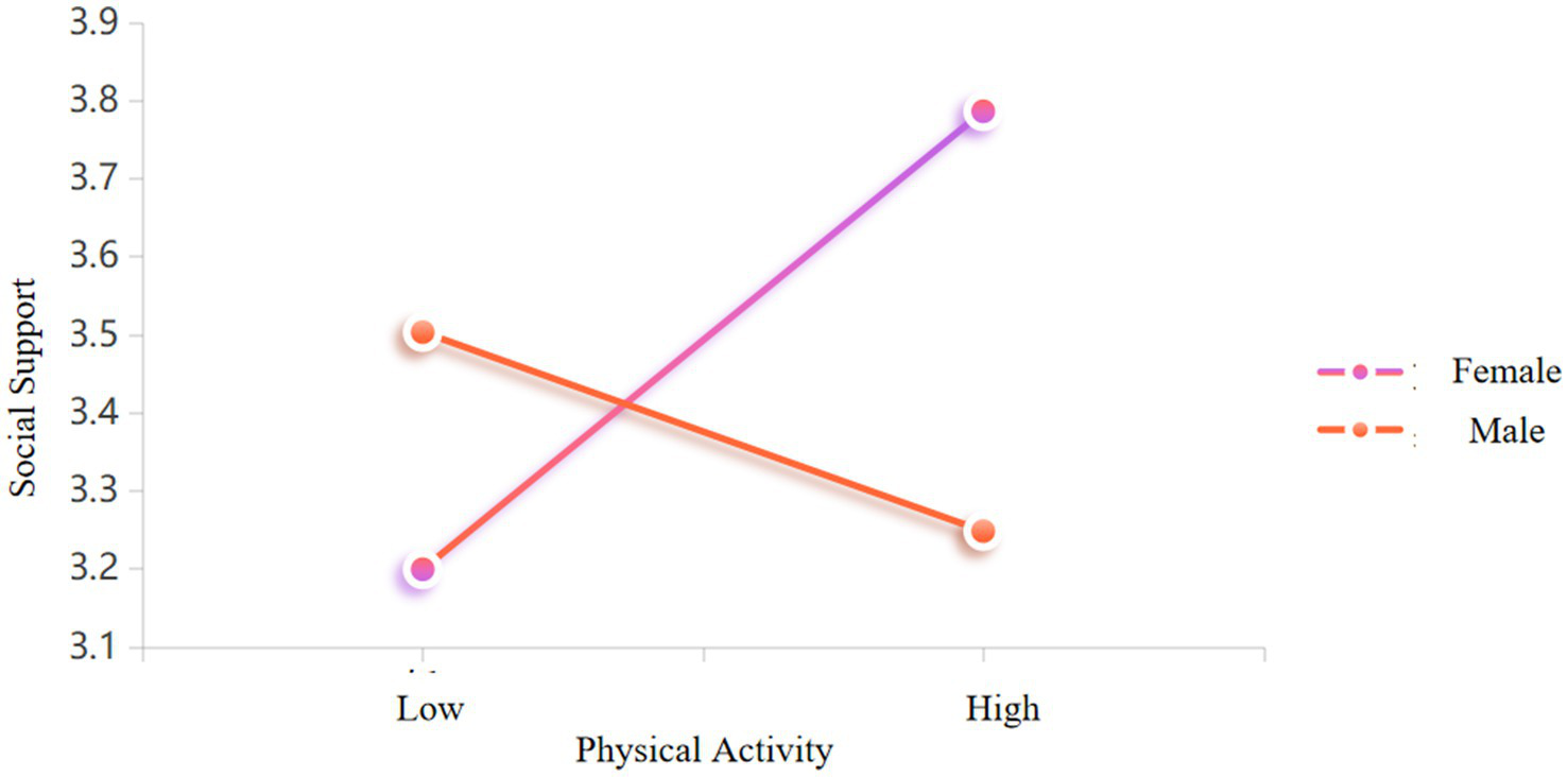 The most noteworthy finding of this study lies in the significant moderating effect of gender (H4 supported), which not only influenced the strength but also the direction of the physical activity–social support association. For female students, physical activity showed a significant positive association with social support (Eagly and Wood, 2012; Knight et al., 2011). This is consistent with the predictions of social role theory, which posits that female social roles emphasize affiliation, cooperation, and interpersonal harmony. The types of physical activity preferred by women (e.g., yoga, dance, group aerobics) often integrate elements of health promotion, body shaping, and social interaction. These activities align closely with socially prescribed female role expectations and inherently provide rich opportunities for emotional exchange and the formation of supportive relationships. Moreover, the self-confidence gained from improved physical self-esteem is readily transferred to socially congruent and proactive interaction patterns, further reinforcing the accumulation of social support resources.