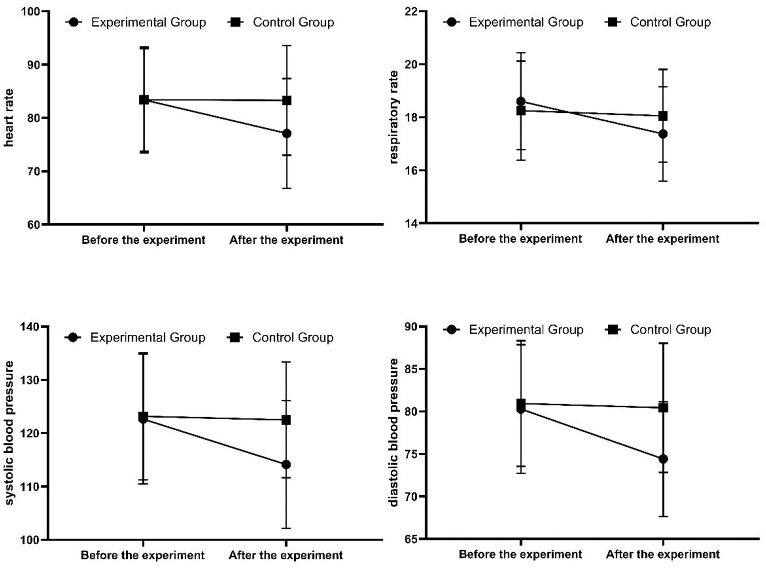In the experimental group, HR, RR, SBP, and DBP after the experiment were significantly lower than the pre-experiment values, and the differences were statistically significant (p < 0.05). In the control group, there were no statistically significant differences in HR, RR, SBP, or DBP between the pre-experiment and post-experiment periods (p > 0.05) (see Figure 3).