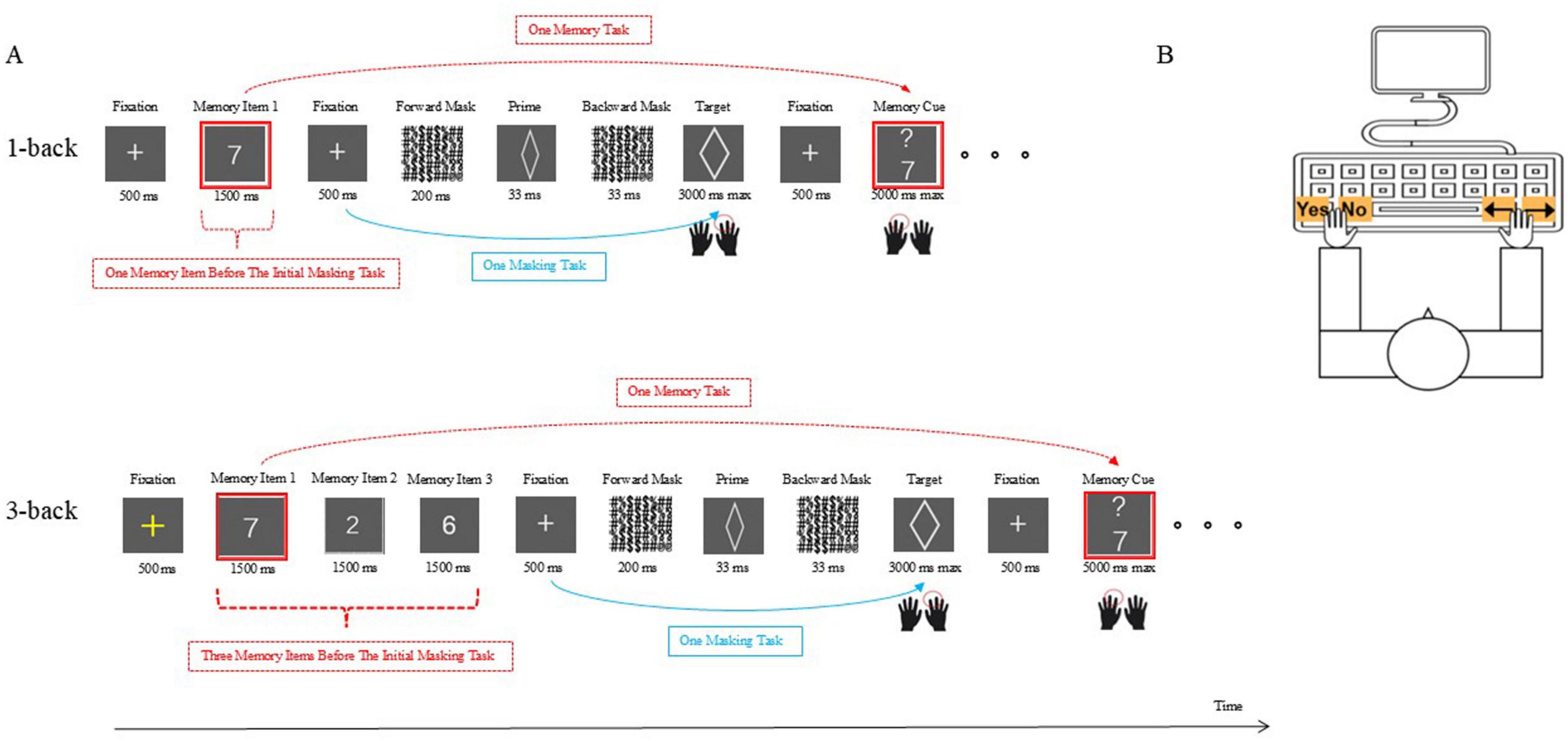Figure 1. Schematic illustration of the dual-task paradigm in Experiment 1. (A) An example of the first N-back task combined with the initial unconscious priming task under low load (top) or under high load (bottom). (B) A schematic illustration of the key press during the dual-task paradigm. The only variation was that in Experiment 2, the stimuli in the unconscious priming task were table tennis balls with hitting points.