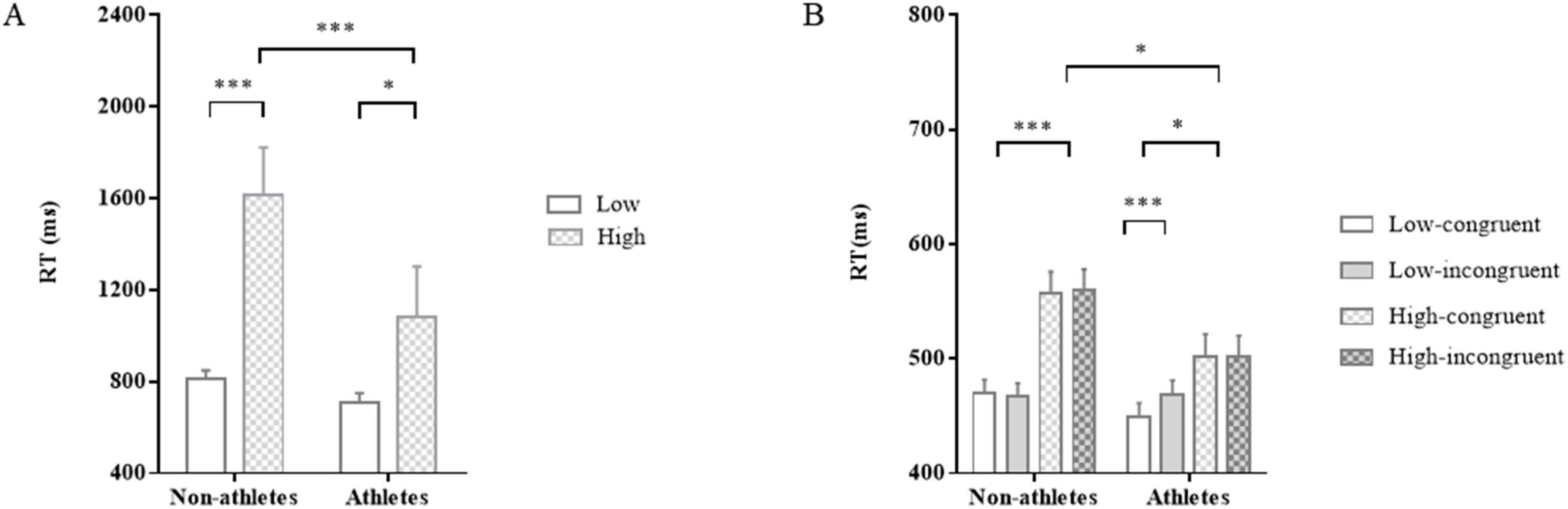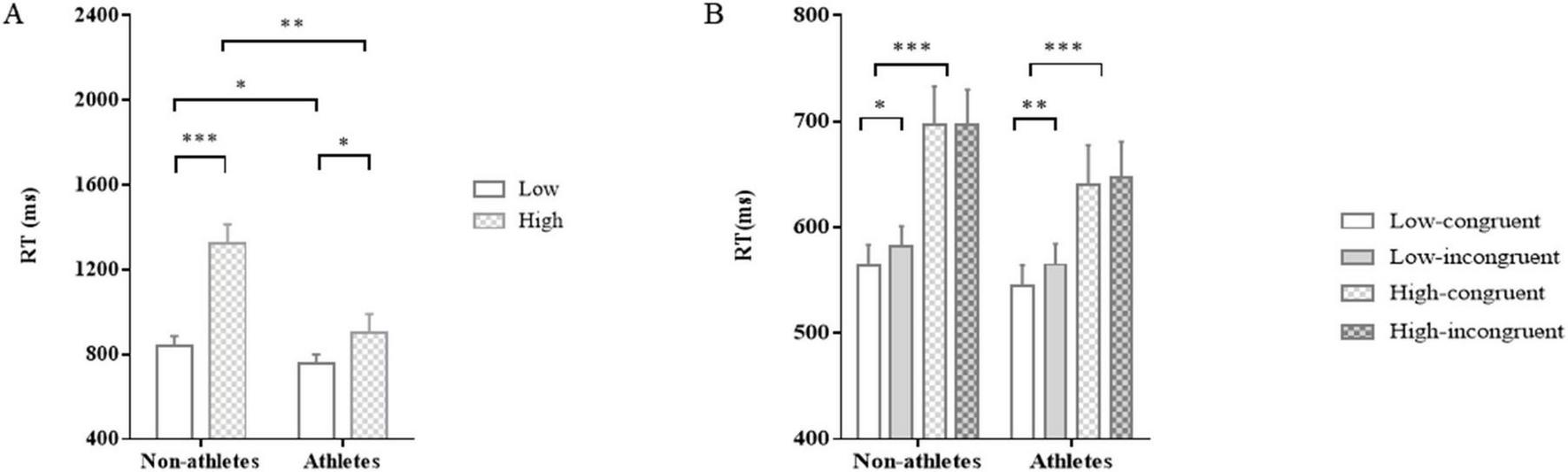 It should be pointed out that a significant interaction between group and congruency was observed, F(1,51) = 4.63, p = 0.04, ηp2 = 0.08. Post-hoc comparisons revealed that athletes’ RT in congruent trials was significantly shorter than that in incongruent trials (p < 0.01), whereas there was no prominent difference in non-athletes’ RT between congruent and incongruent trials (p = 0.96). Additionally, neither an main effect of group, F(1,51) = 2.79, p = 0.10, ηp2 = 0.05, nor an interaction between load and congruency, F(1,51) = 3.01, p = 0.09, ηp2 = 0.06, was found.