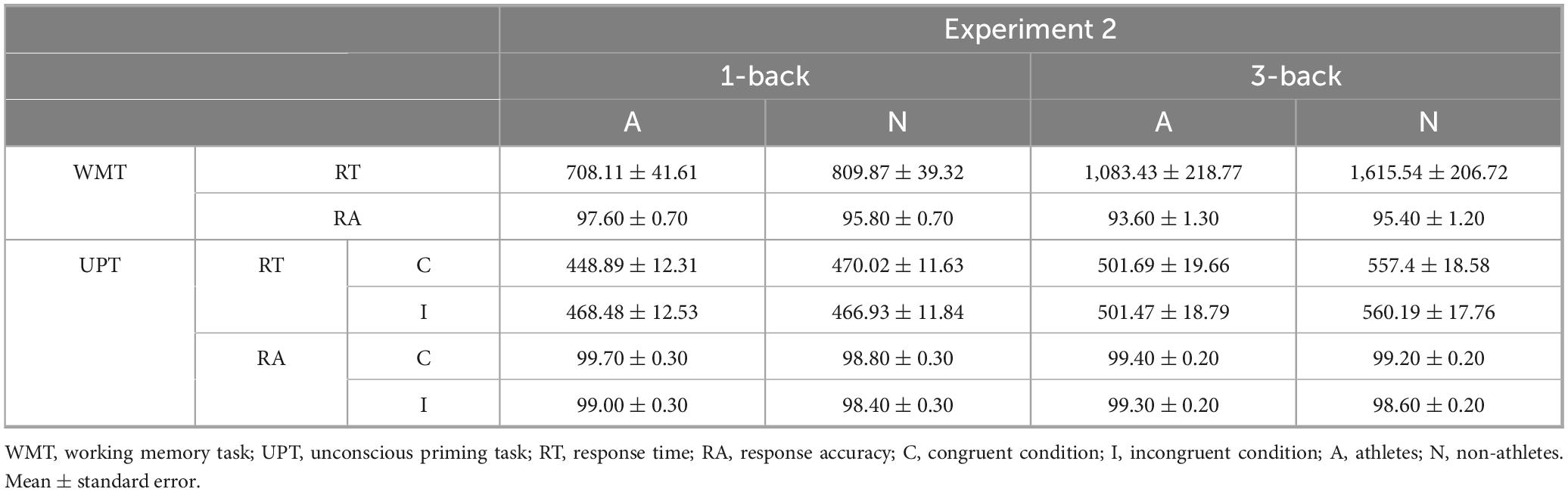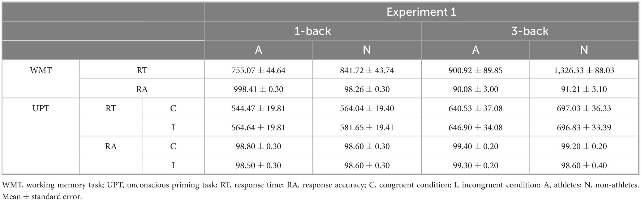We first tested the unconscious priming performance of athletes under working-memory load when the unconscious stimuli were unrelated to their expertise domain. Based on prior literature (Kalén et al., 2021; Mao and Li, 2022), we hypothesized that there would be no significant difference in unconscious priming effects with increased working-memory load between athletes and non-athletes.