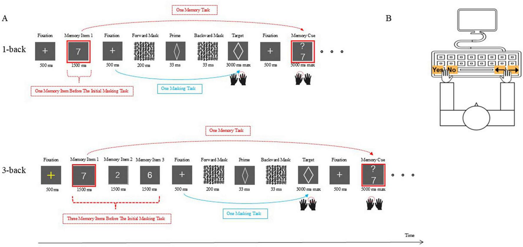 Our main task was developed by combining an N-back task with an unconscious priming task. That is, each forward-backward masking priming task was inserted into each N-back task (see Figure 1). Participants were required to remember the memory items and update them as instructed (an N-back task using numbers as stimuli) while making judgments on geometric figures (a masked priming task using geometric figures as stimuli).