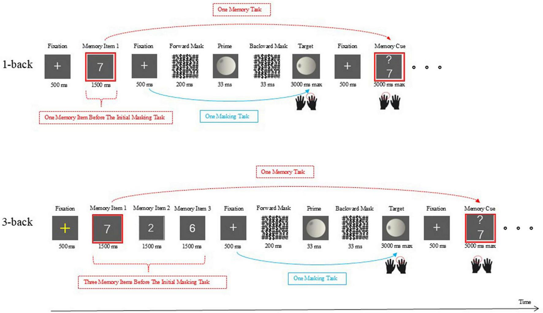After the priming task was completed, a white fixation cross (500 ms) was shown, followed by a memory cue. The participants had to indicate whether the new item matched the one (the first one at high load condition) that came one masking task before it. Participants were instructed to not only respond to the new memory cue with their left hand (“z” for “yes” and “c” for “no”) but also maintain the new memory cue. This was because the new memory cue would be compared with the next memory cue after the completion of the subsequent next masking task (or after the completion of three masking tasks under the high-load condition). When a response was collected or after 5,000 ms, the screen went blank, and the next masking task was to start.
