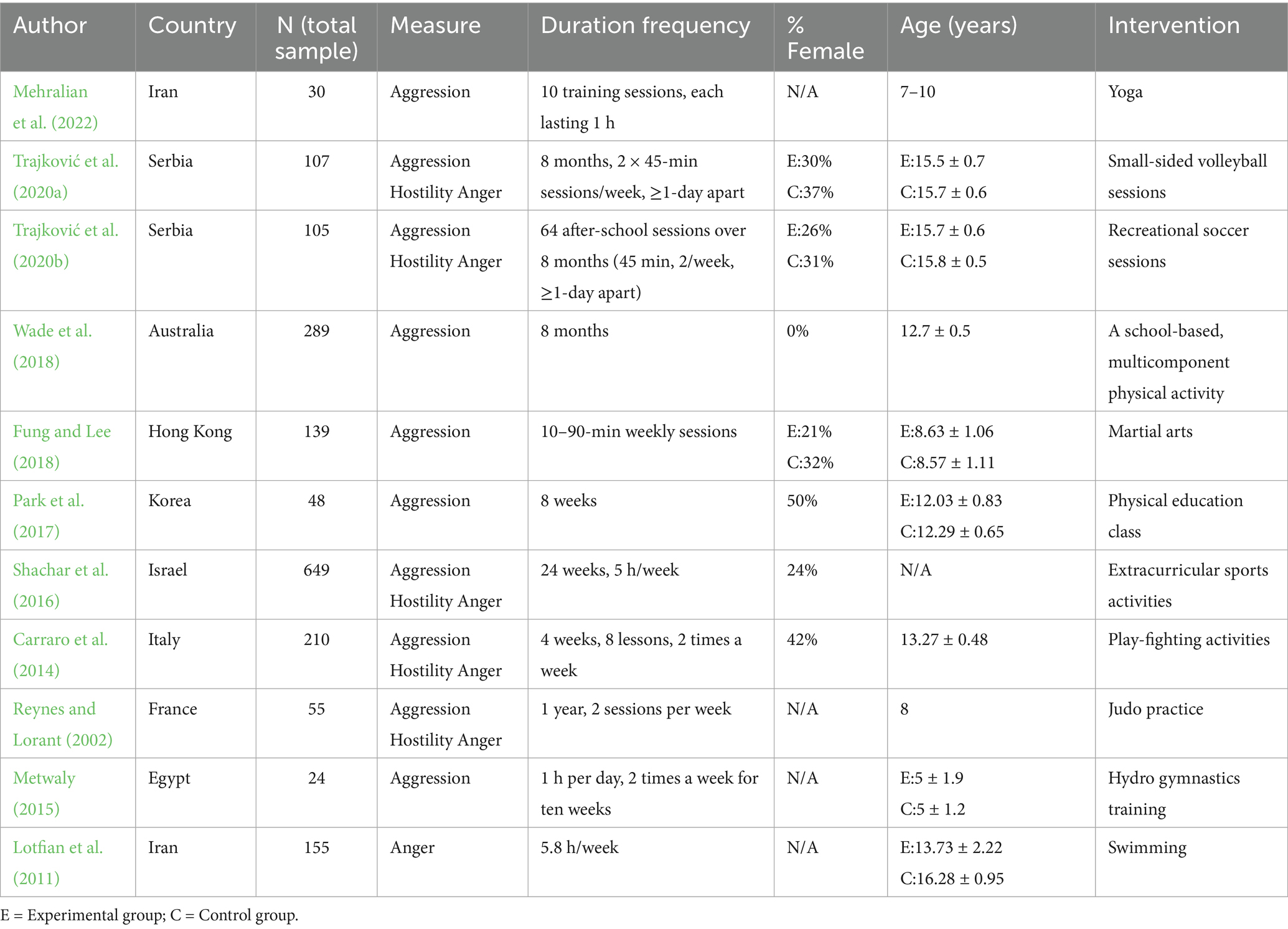 These 11 studies collectively involved 1811 participants. All included studies compared post-intervention outcomes between exercise intervention groups and non-intervention control groups. Outcomes consisted of quantitative assessments of aggression and related constructs, specifically aggression, hostility, and anger. The duration of intervention periods varied across the studies. Key characteristics of the included studies are summarized in Table 1.