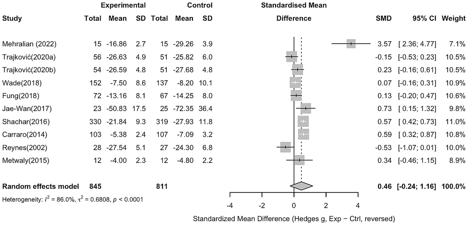 For aggression, 10 studies with 845 participants in the intervention group and 811 in the control group were included. The pooled analysis showed no significant overall effect of sports interventions compared to controls (Hedges’ g = 0.46, 95% CI − 0.24 to 1.16), with considerable heterogeneity (I2 = 86%). Several individual studies reported significant reductions in aggression, while others showed non-significant or opposite effects, with specific results shown in Figure 5.