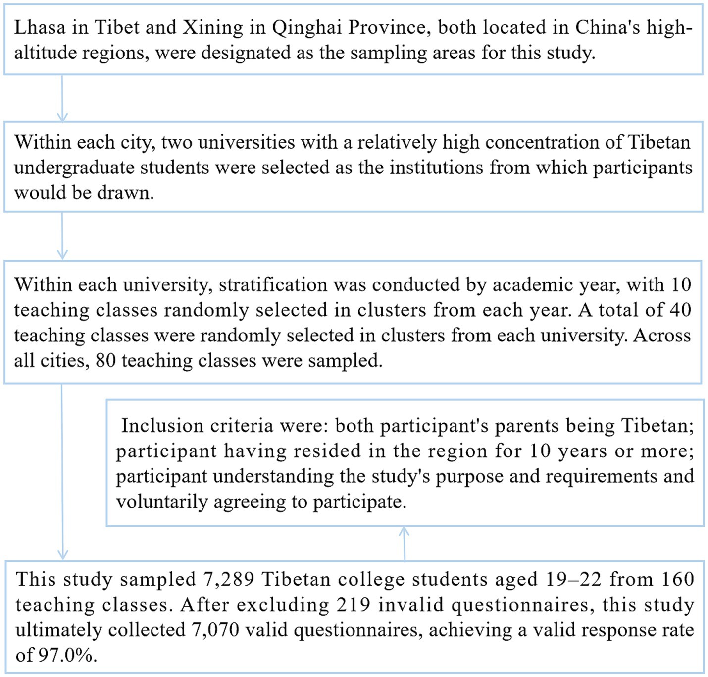 Participants in this study were selected using stratified cluster sampling, following these specific steps. This research adopted a multi-stage sampling approach conducted across high-altitude regions of China. Lhasa in Tibet and Xining in Qinghai Province were chosen as the primary sampling locations. Within each city, two universities with substantial populations of Tibetan undergraduate students were selected. The sampling process further involved stratification by academic year, with 10 classes randomly cluster-sampled from each year per university. This resulted in the selection of 40 classes per institution, totaling 80 classes across both cities. The final sample comprised 7,289 Tibetan college students aged 19 to 22, drawn from 160 academic classes. All students within each class meeting the inclusion criteria participated in the cross-sectional questionnaire survey. Inclusion criteria were: both participants’ parents being Tibetan; participant having resided in the region for 10 years or more; participant understanding the study’s purpose and requirements, and voluntarily agreeing to participate. After excluding 219 invalid questionnaires, this study ultimately collected 7,070 valid questionnaires, achieving a valid response rate of 97.0% (Figure 1).
