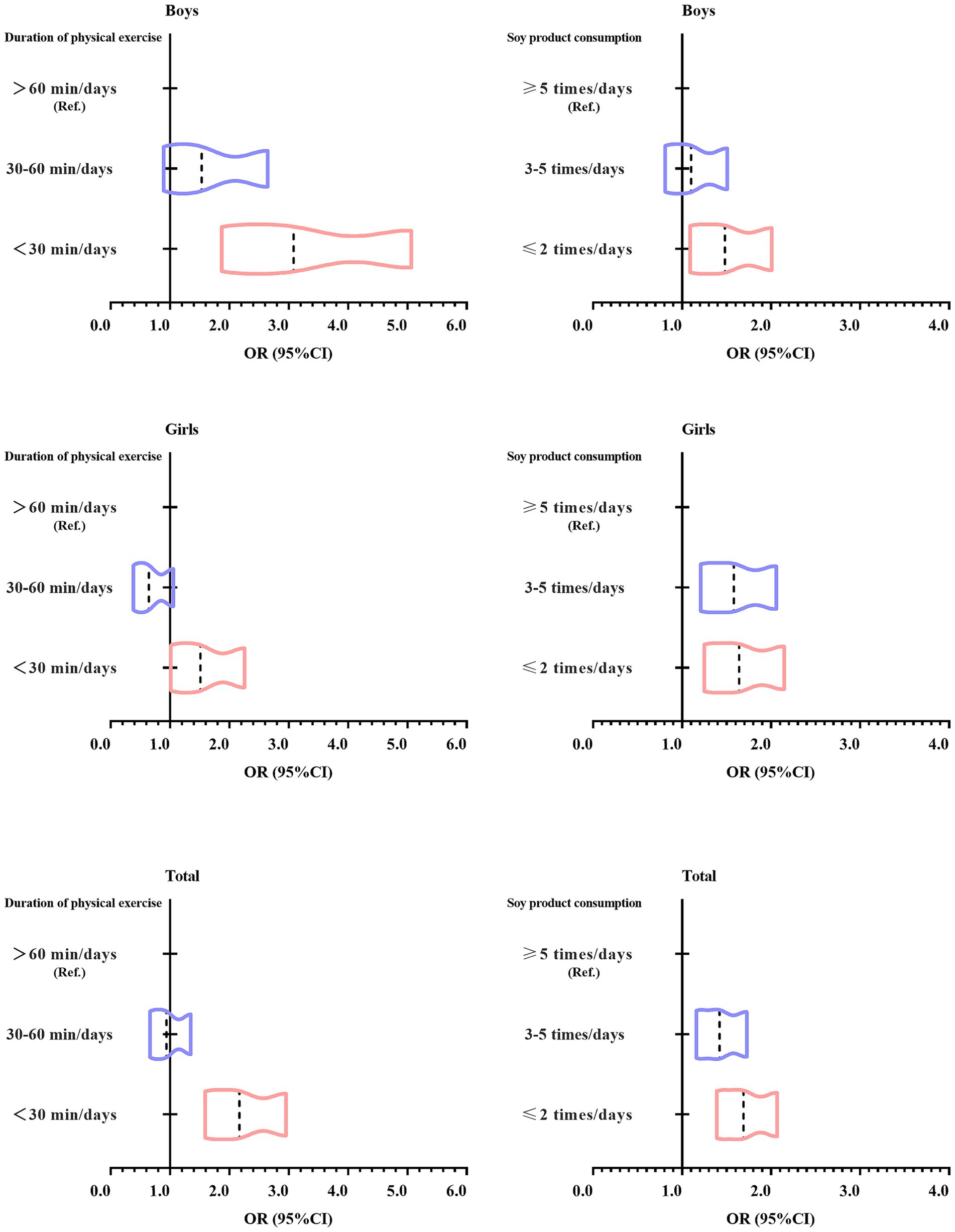 Figure 2 shows the trend in odds ratio (OR) values from a binary logistic regression analysis examining soy product consumption, duration of physical exercise, and psychological symptoms among Tibetan college students in China’s high-altitude regions. The figure indicates that as soy product consumption and duration of physical exercise decrease, the risk of developing psychological symptoms gradually increases, with the OR values shifting to the right.