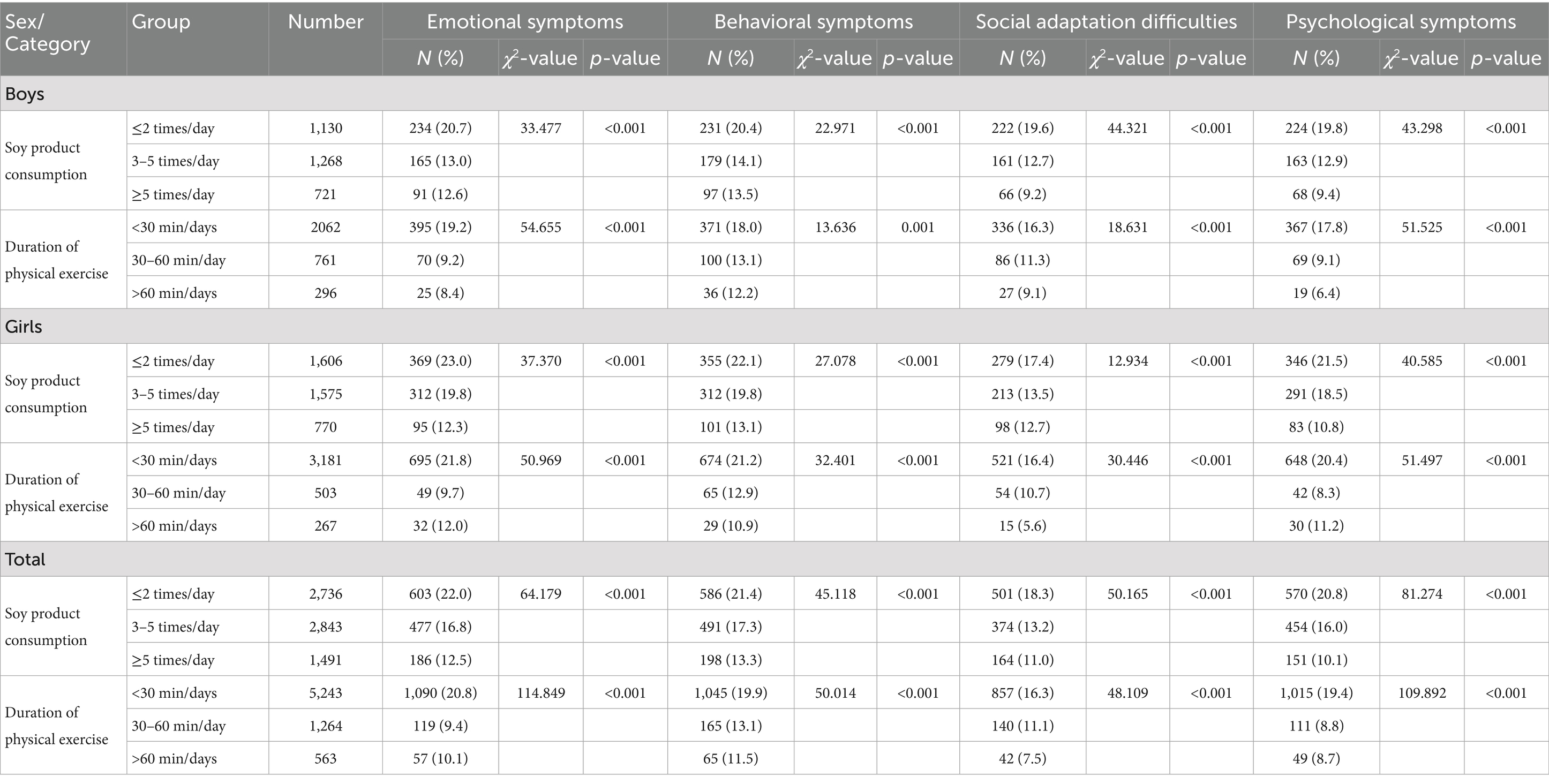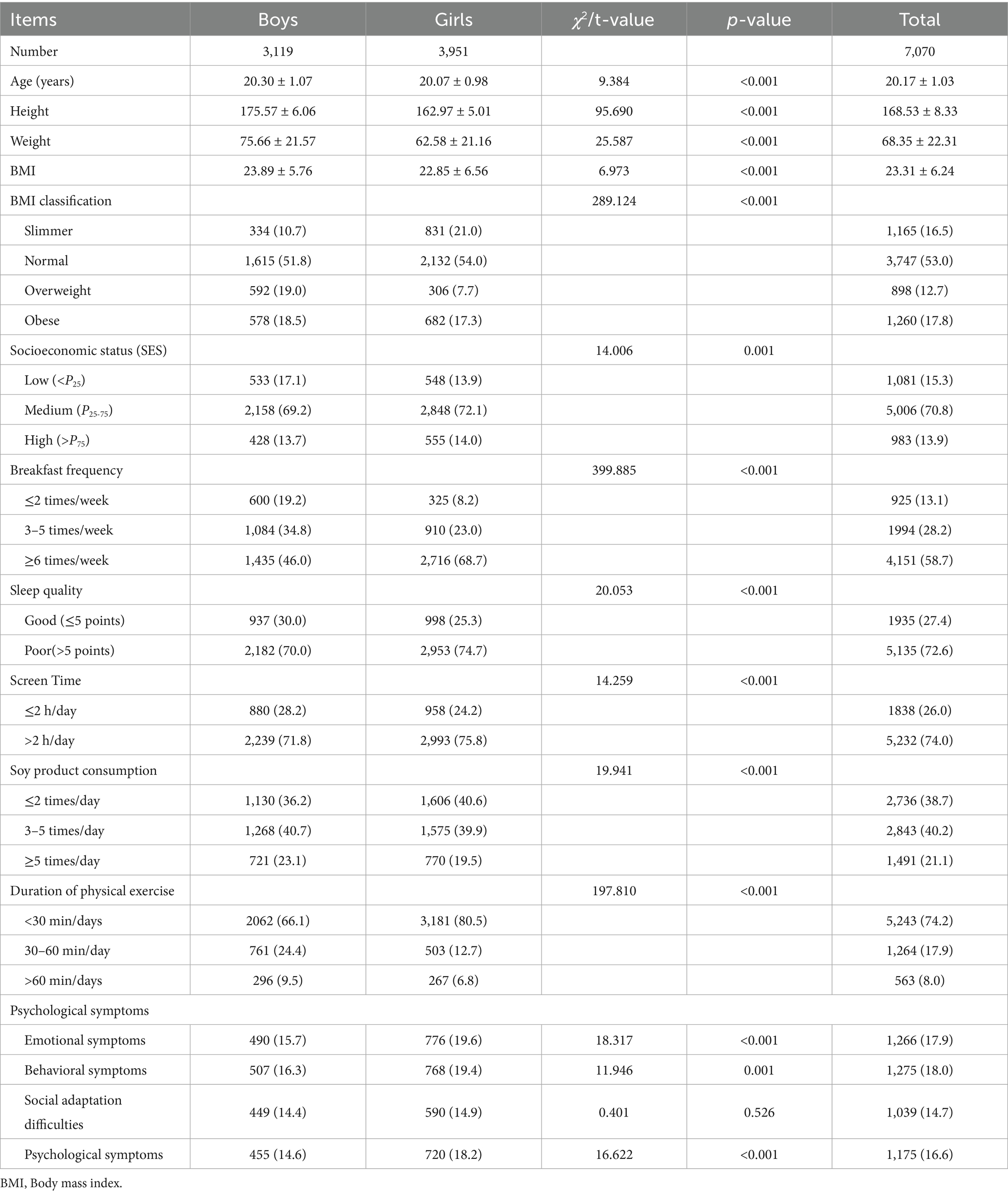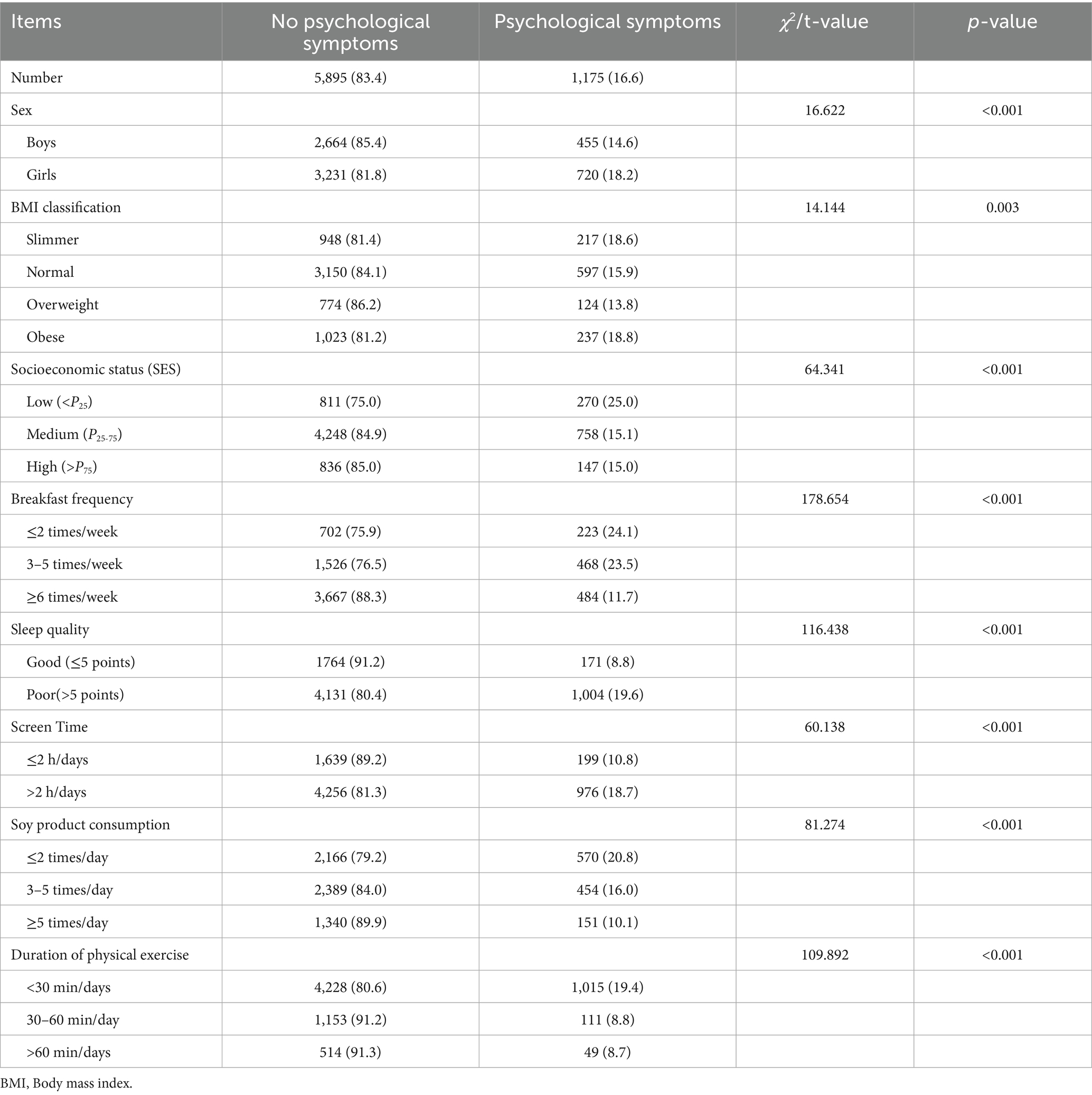 This study the average age of participants was (20.17 ± 1.03) years. Participants’ height, weight, and BMI were (168.53 ± 8.33) cm, (68.35 ± 22.31) kg, and (23.31 ± 6.24) kg/m2, Differences between sexes were statistically significant (t = 95.690, 25.587, 6.973, p < 0.001). The results of this study indicate that among Tibetan college students in high-altitude regions of China, the proportions consuming soy products ≤2 times/day, 3–5 times/day, and ≥5 times/day were 38.7, 40.2, and 21.1%, respectively, comparisons between sex showed statistically significant differences (χ2 = 19.941, p < 0.001). The proportions of physical exercise duration being <30 min/day, 30–60 min/day, and >60 min/day were 74.2, 17.9, and 8.0%, respectively. Comparing these proportions between sexes revealed a statistically significant difference (χ2 value = 197.810, p < 0.001). The prevalence of psychological symptoms among Tibetan college students in China’s high-altitude regions was 16.6%. Regarding different dimensions, the proportions of emotional symptoms, behavioral symptoms, and social adaptation difficulties among Tibetan college students in China’s high-altitude regions were 17.9, 18.0, and 14.7%, respectively. Comparison results for other categories are shown in Table 1.