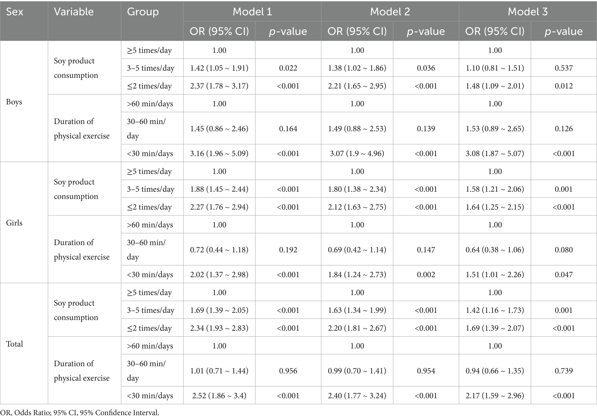 Table 4. Binary logistic regression analysis of soy product consumption, duration of physical exercise, and psychological symptoms among Tibetan college students in China’s high-altitude regions.