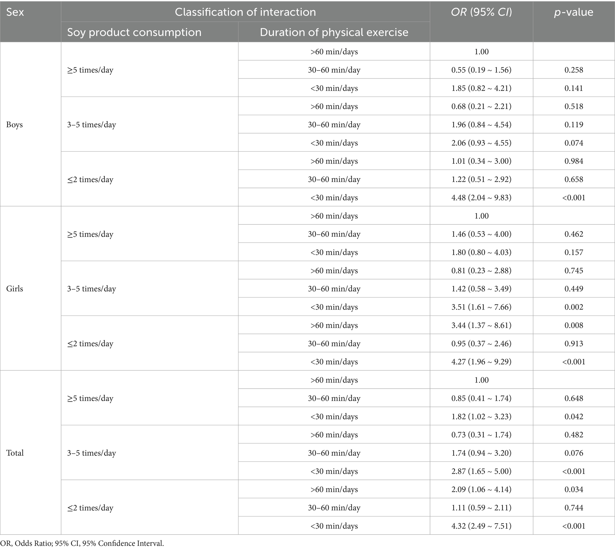 Table 5 presents the binary logistic regression analysis of generalized linear models for soy product consumption, duration of physical exercise, and psychological symptoms among Tibetan college students in China’s high-altitude regions. After stratifying by sex, this study employed the presence (Yes = 1, No = 0) of psychological symptoms among Tibetan college students in high-altitude areas of China as the dependent variable. Bivariate logistic regression analyses using generalized linear models were conducted with different combinations of soy product consumption (≥5 times/day, 3–5 times/day, ≤2 times/day) and duration of physical exercise (>60 min/day, 30–60 min/day, <30 min/day) as independent variables. The overall analysis after covariate adjustment revealed that, compared with the reference group (soy product consumption ≥5 times/day and duration of physical exercise >60 min/day), the group with soy product consumption ≤2 times/day and duration of physical exercise <30 min/day had the highest risk of depressive symptoms (OR = 4.32, 95% CI: 2.49–7.51) (p < 0.001). Results of the stratified analysis by sex are presented in Table 5.