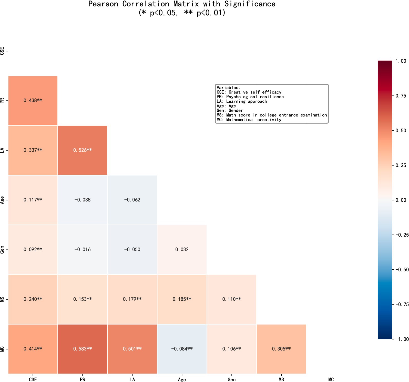A Pearson correlation analysis was conducted to examine the relationships various variables, and mathematical creativity. The results showed significant positive correlations among the main variables (p < 0.01). Creative self-efficacy, learning approaches, and psychological resilience were strongly and positively associated with mathematical creativity, indicating that students with higher self-efficacy and deeper learning approach tend to demonstrate greater creativity in mathematics. More specific details are shown in Figure 2.