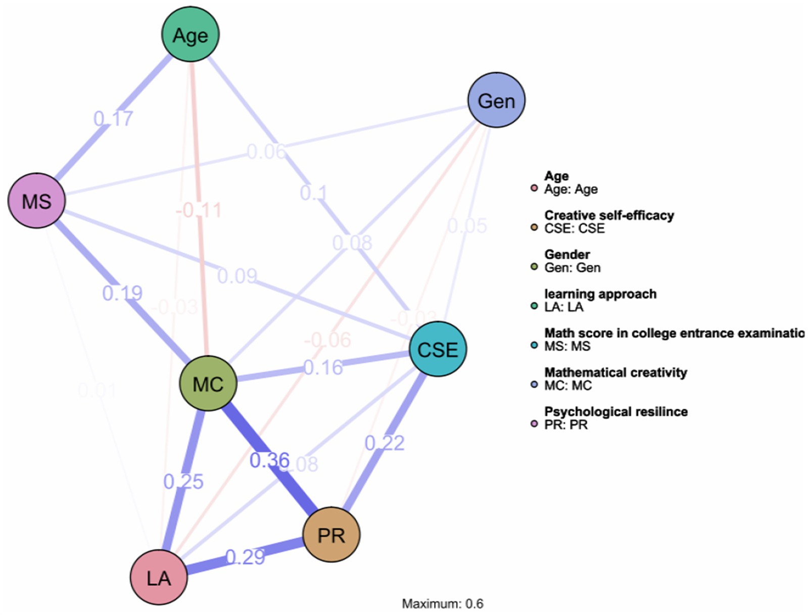 This network diagram displays the interconnections among study variables using network analysis (see Figure 4). Node colors represent different variable types: age (green), gender (blue), creative self-efficacy/CSE (teal), mathematical creativity/MC (dark green), learning approach/LA (pink), psychological resilience/PR (orange), and math score in college entrance examination /MS (purple). Edge thickness and saturation indicate association strength, with thicker lines representing stronger relationships. The network reveals the complex interdependencies among psychological and demographic variables influencing mathematical creativity.