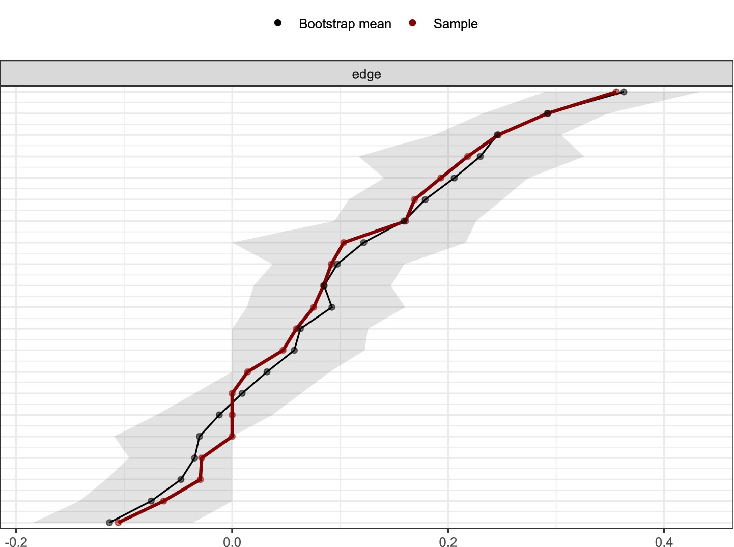 Figure 6 shows the bootstrap stability analysis for network edge weights. The red line represents the sample edge weights, while the black line shows bootstrap mean values with gray confidence intervals. The close alignment between sample and bootstrap means, along with narrow confidence intervals, demonstrates good stability and reliability of the estimated network structure. The analysis confirms that the observed edge weights are robust and not due to sampling variability.
