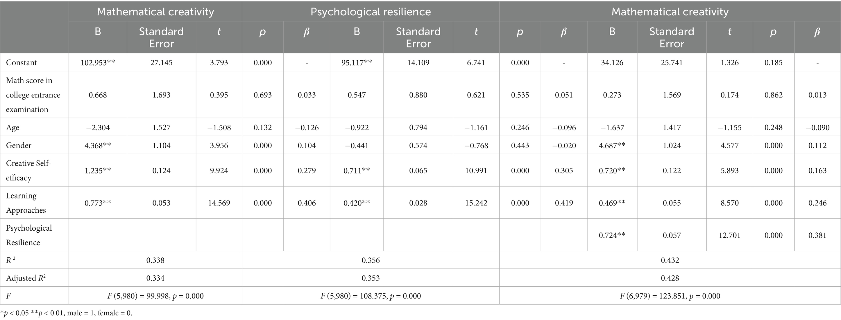 Table 2 presents the results of a mediation analysis examining whether psychological resilience mediates the relationship between learning approaches and mathematical creativity outcomes, controlling the variables of math score in college entrance examination, age, gender, and creative self-efficacy, which can eliminate potential confounding effects, improve estimation accuracy, enhance the robustness of results, and reflect theoretical rigor. Among the control variables, math score in college entrance examination (β = 0.013, p = 0.862) and age (β = −0.090, p = 0.248) were nonsignificant, while gender (β = 0.112, p < 0.001) and creative self-efficacy (β = 0.163, p < 0.001) showed significant direct effects on mathematical creativity. The analysis includes three models: direct effects on mathematical creativity, effects on the mediator (psychological resilience), and the full mediation model. Significant coefficients are marked with asterisks (*p < 0.05, **p < 0.01), with standardized beta coefficients, standard errors, t-values, and p-values reported for each pathway.