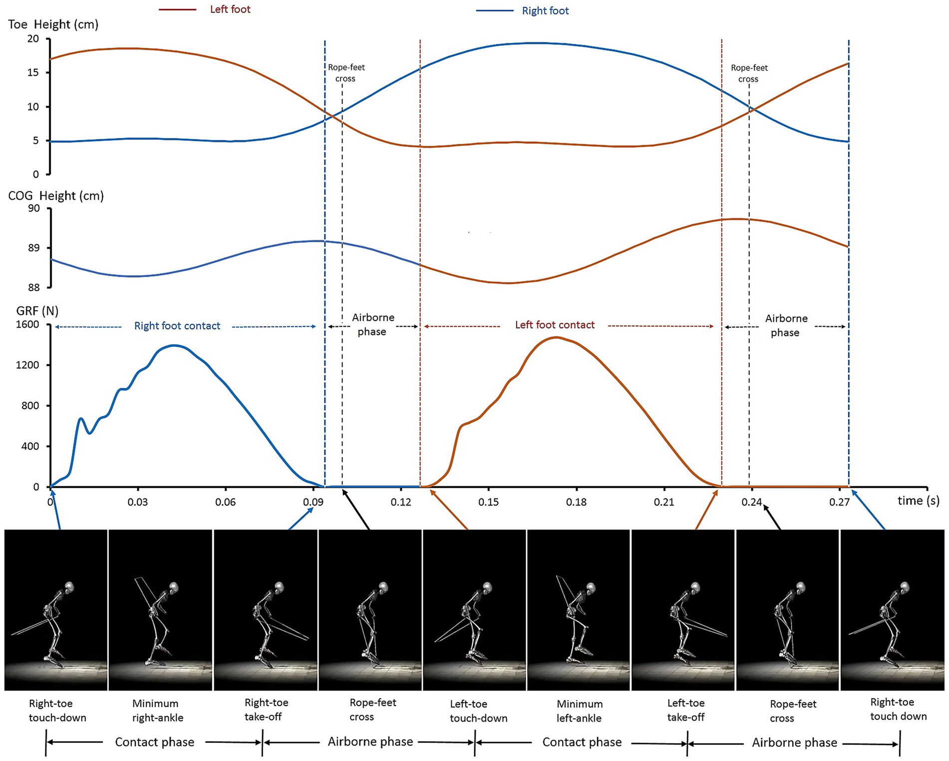 Figure 1. A representative one-cycle dataset obtained through synchronized measurements and biomechanical modeling. The figure illustrates the main characteristics of body–rope–ground interactions (graphs) and joint coordination quantified by biomechanical modeling (bottom).