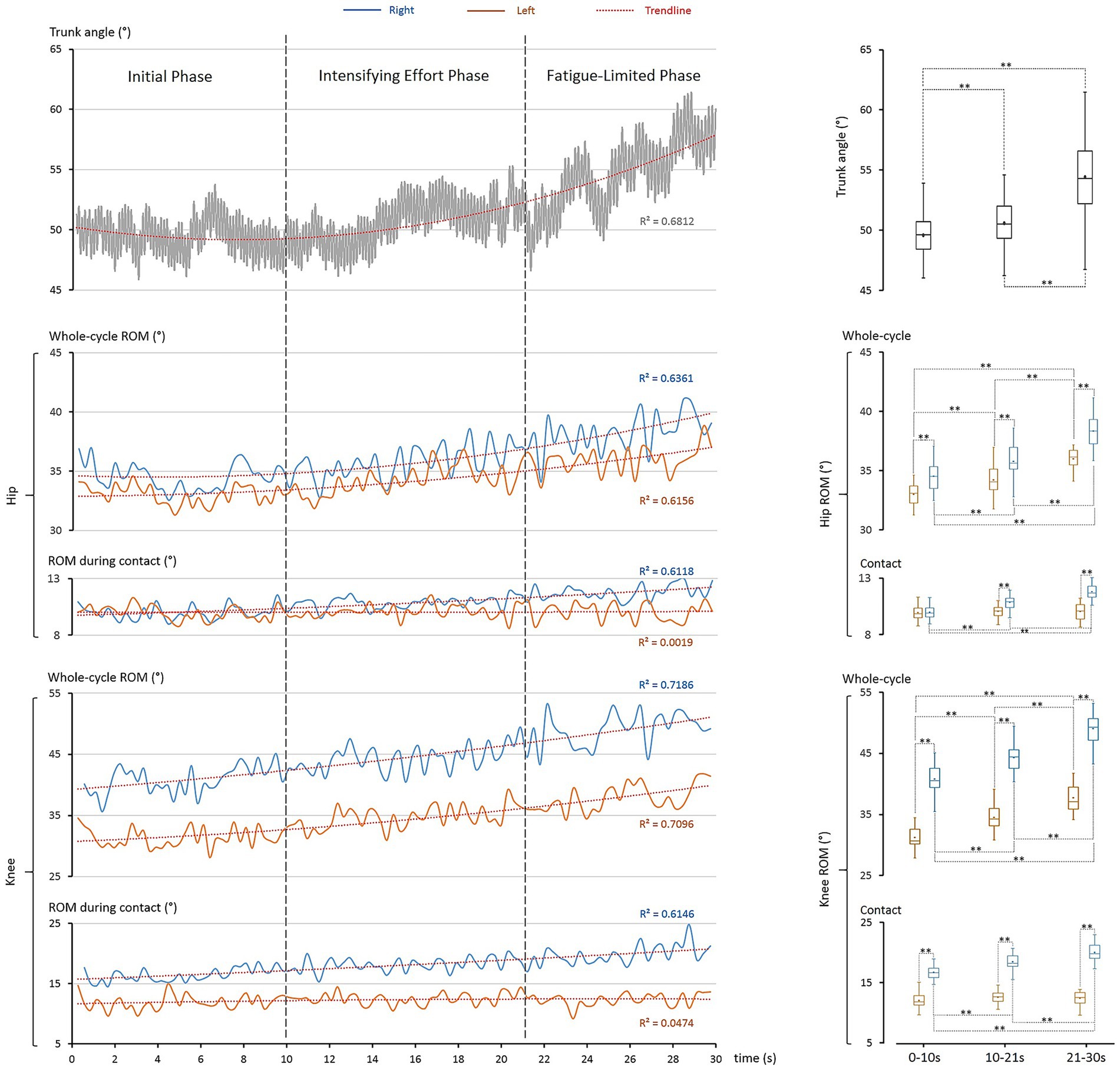 Figure 4. Kinematic adaptations during the 30-s single-rope speed sprint. The left column illustrates time-dependent changes in key kinematic parameters, and the right column presents corresponding statistical distributions. Boxplot elements are as defined in Figure 2. Top panel: trunk angle progressively increased across phases (R2 = 0.681), with significant differences among phases (**: p < 0.001). Middle panel: hip ROM increased over time in both limbs (R2 > 0.616), with the right hip consistently larger (**: p < 0.001); left-hip ROM during contact remained stable (R2 = 0.002), while right-hip increased significantly (R2 = 0.612, **: p < 0.001). Bottom panel: knee ROM showed strong asymmetries, with larger values in the right knee (**: p < 0.001). Whole-cycle ROM rose progressively (R2 > 0.709) for both, while right-knee ROM during contact increased significantly (R2 = 0.615, **: p < 0.001) and left-knee ROM remained stable (R2 = 0.047).