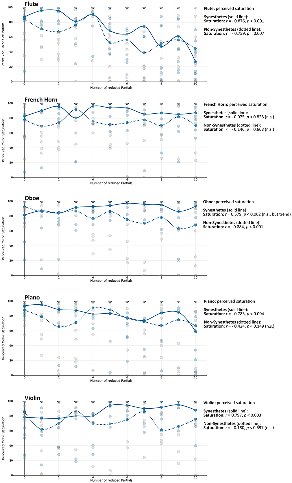 Saturation: For flute, piano and violin, partial reduction was found to influence the saturation of perceived colors, particularly among synesthetes. As more partials were removed, synesthetes perceived less saturated colors for flute and piano (see Table 2). In contrast, for violin this relationship was reversed: the impression of saturation increased with the number of reduced partials. Among non-synesthetes, a corresponding decrease in saturation was observed for flute and oboe (also see Figure 1). No significant correlations were found for the French horn or for Hue values across any instruments. Overall, the data indicated substantial variability in timbre-induced color saturation across participants, complicating the emergence of a clear overall pattern. For flute and piano (and, among non-synesthetes, for oboe), saturation decreased with the number of reduced partials, meaning that color perception tends to become greyer as more partials were removed. Furthermore, synesthetes and non-synesthetes seem to share the impression of saturation most strongly for the flute. Conversely to these saturation decreases, for violin in synesthetes—and to a lesser extent, oboe in non-synesthetes—the perceived saturation increased with the number of reduced partials (see Figure 2 and Table 2).