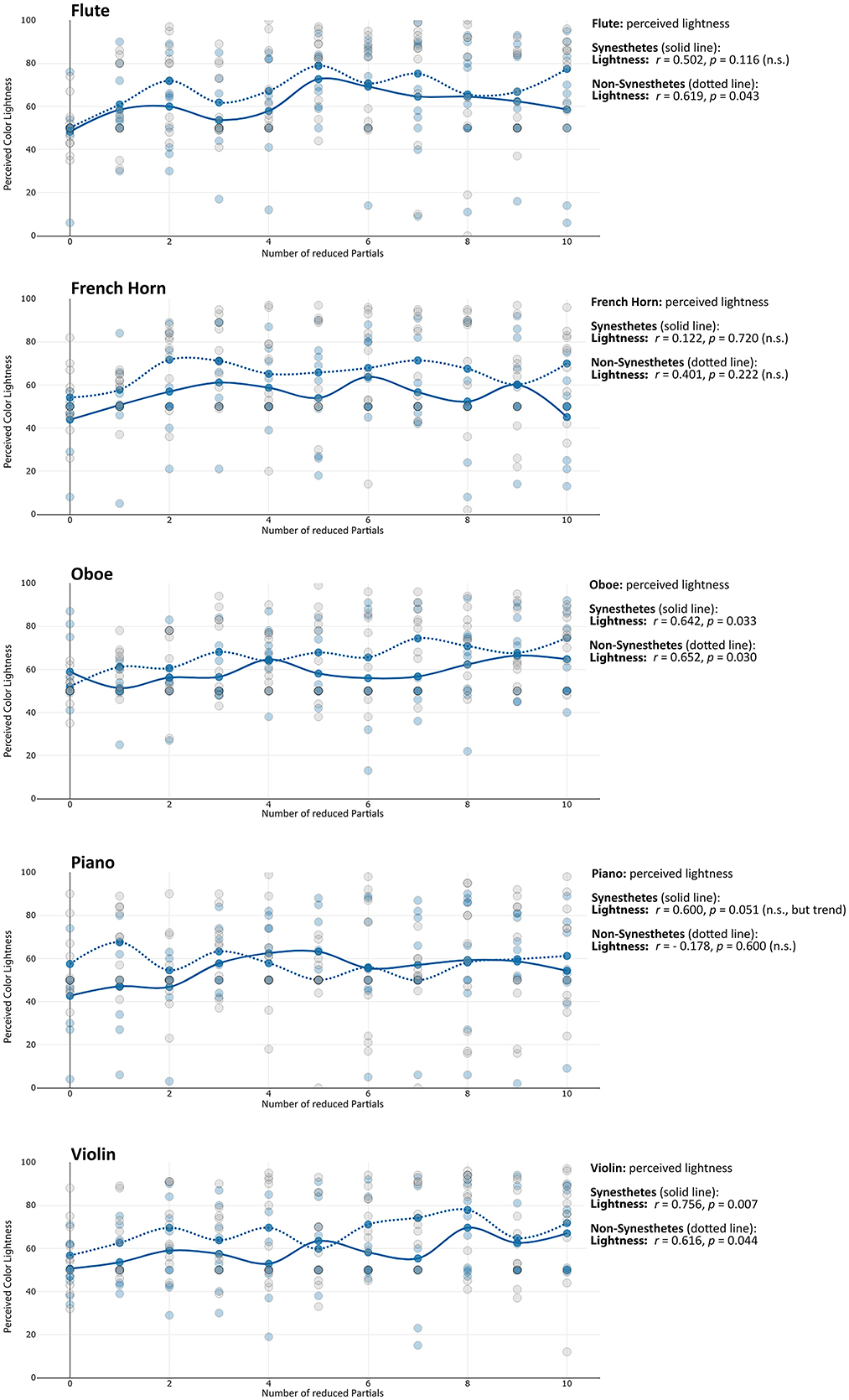 Figure 2. Changes in perceived lightness of the timbre-induced color perception in synesthetes with the number of reduced partials. The individual points reflect the saturation perception of the individual test subjects (blue = synesthetes, grey = non-synesthetes).